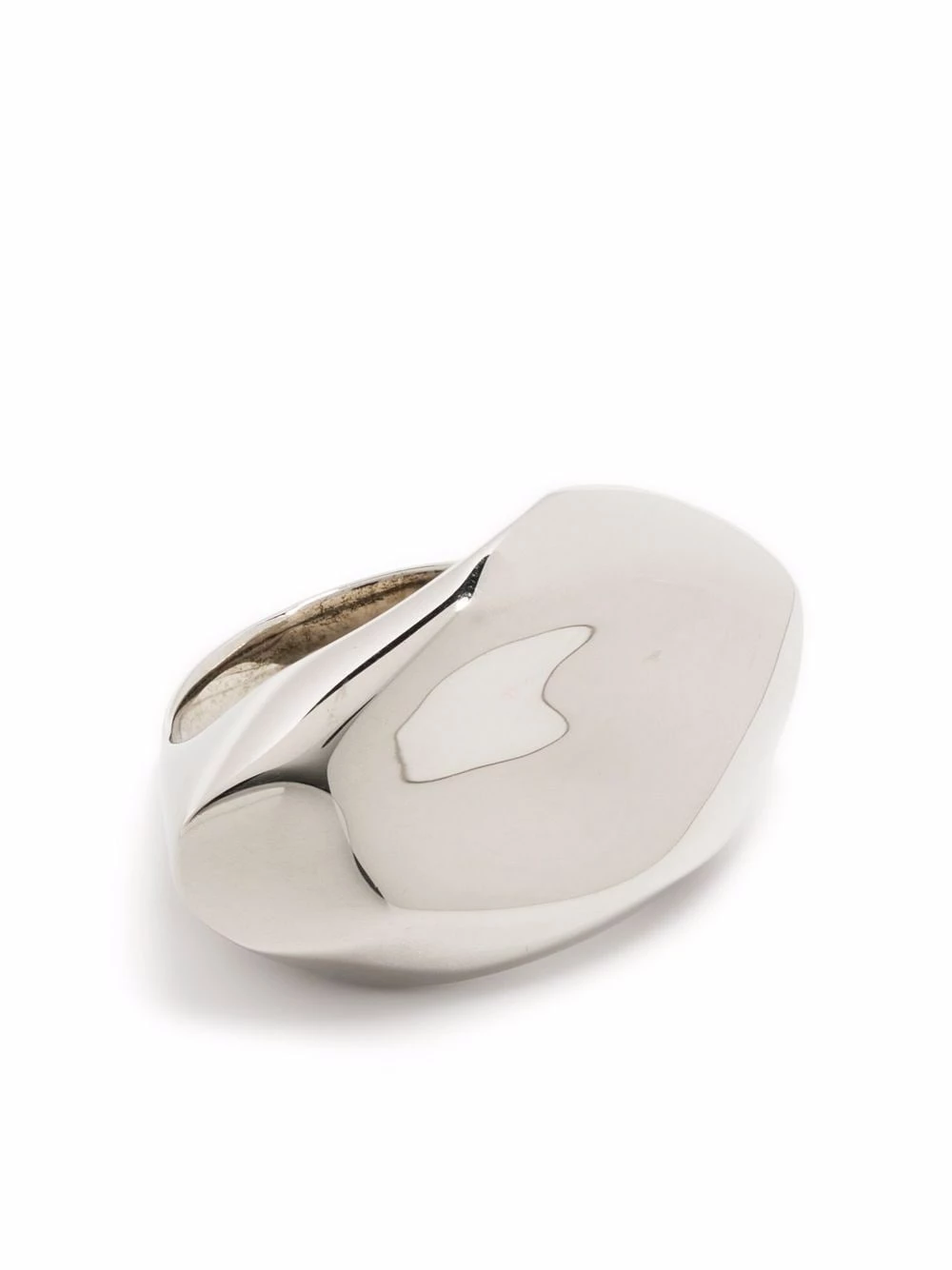 In a polished silver-tone finish, Alexander McQueen’s Molten ring reflects the brand’s penchant for sculptural silhouettes and incorporating organic shapes into their designs.Â