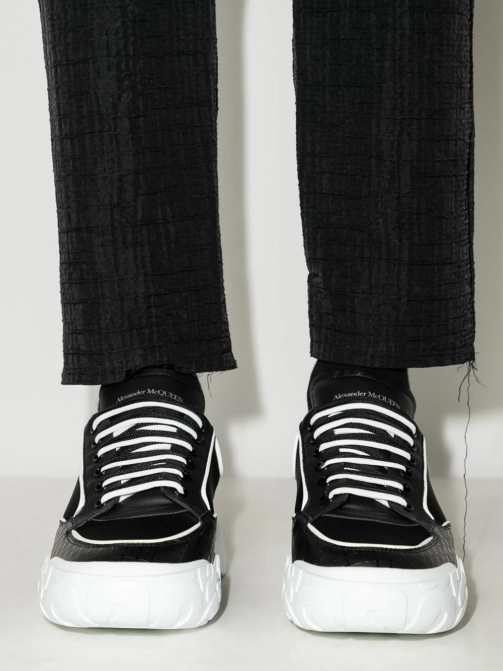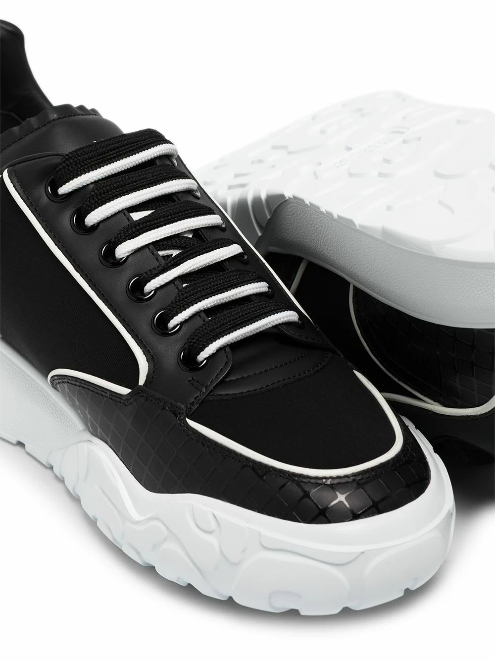 Alexander McQueen’s New Court sneakers have a sleek black design which is punctuated with a white contrasting piped trim across the upper and an oversize ridged rubber sole.