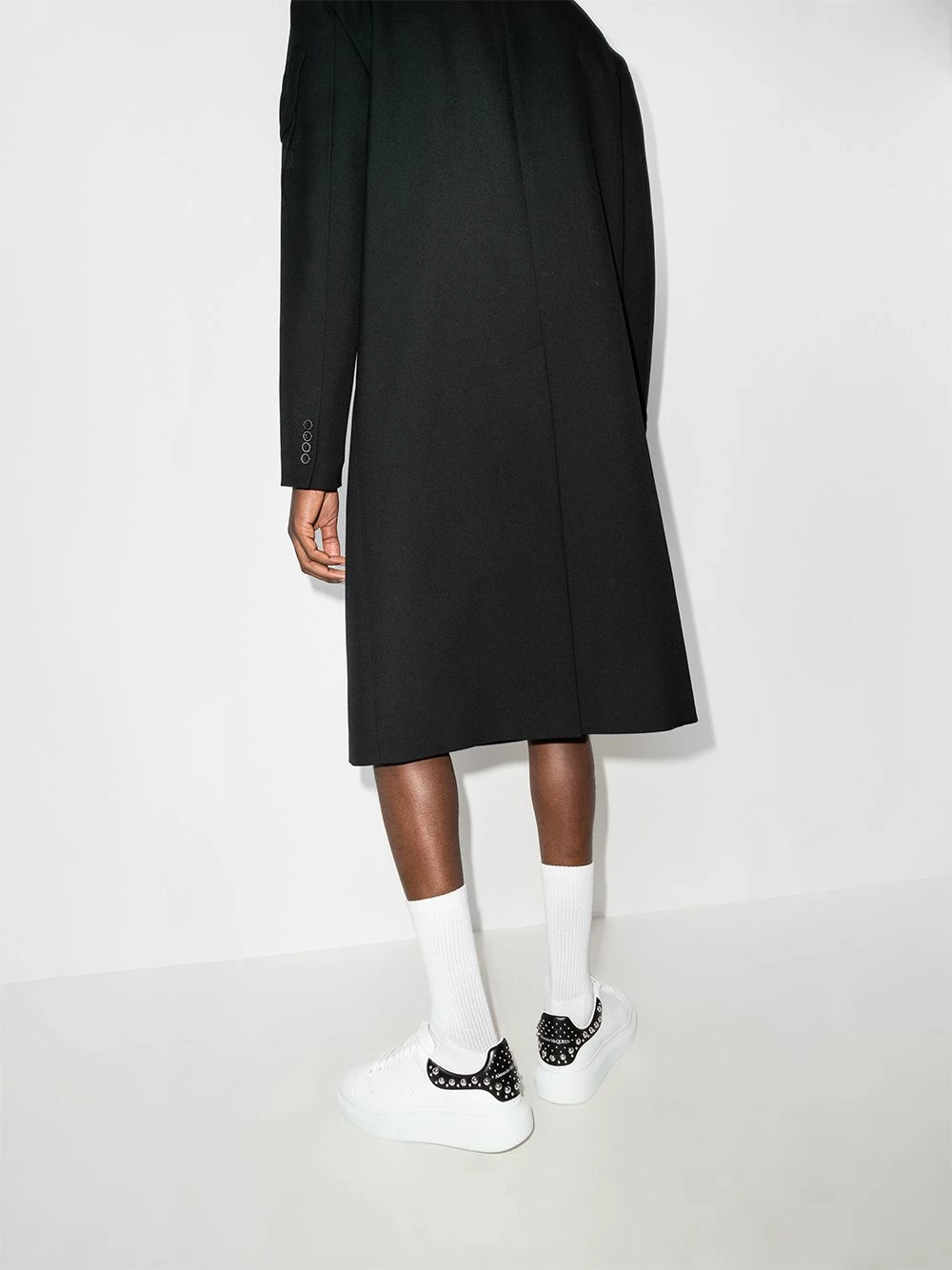 Launched in 2015, the Oversized sneakers are an iconic Alexander McQueen style. For AW21, the signature sneakers are presented with a pearl and sequin-embellished branded heel counter. In a white hue, these low-top trainers sit atop the characteristic oversized rubber sole.