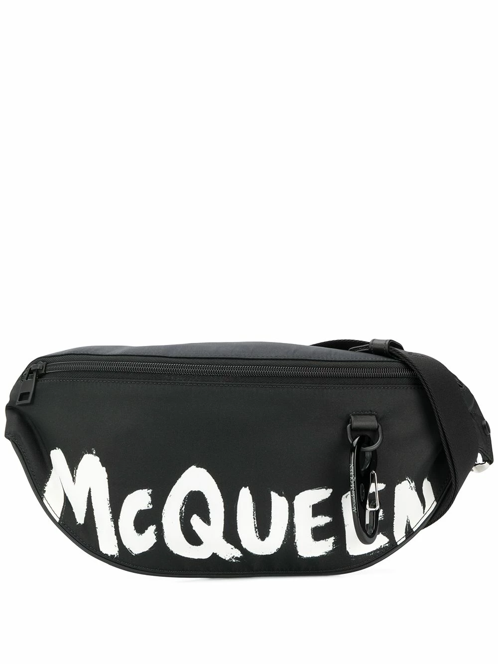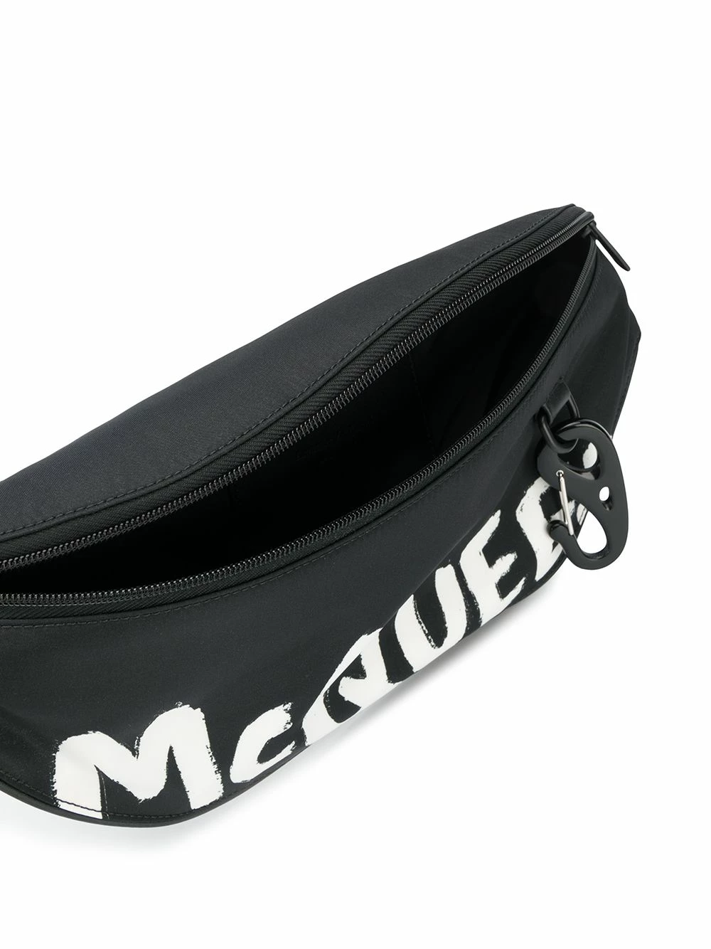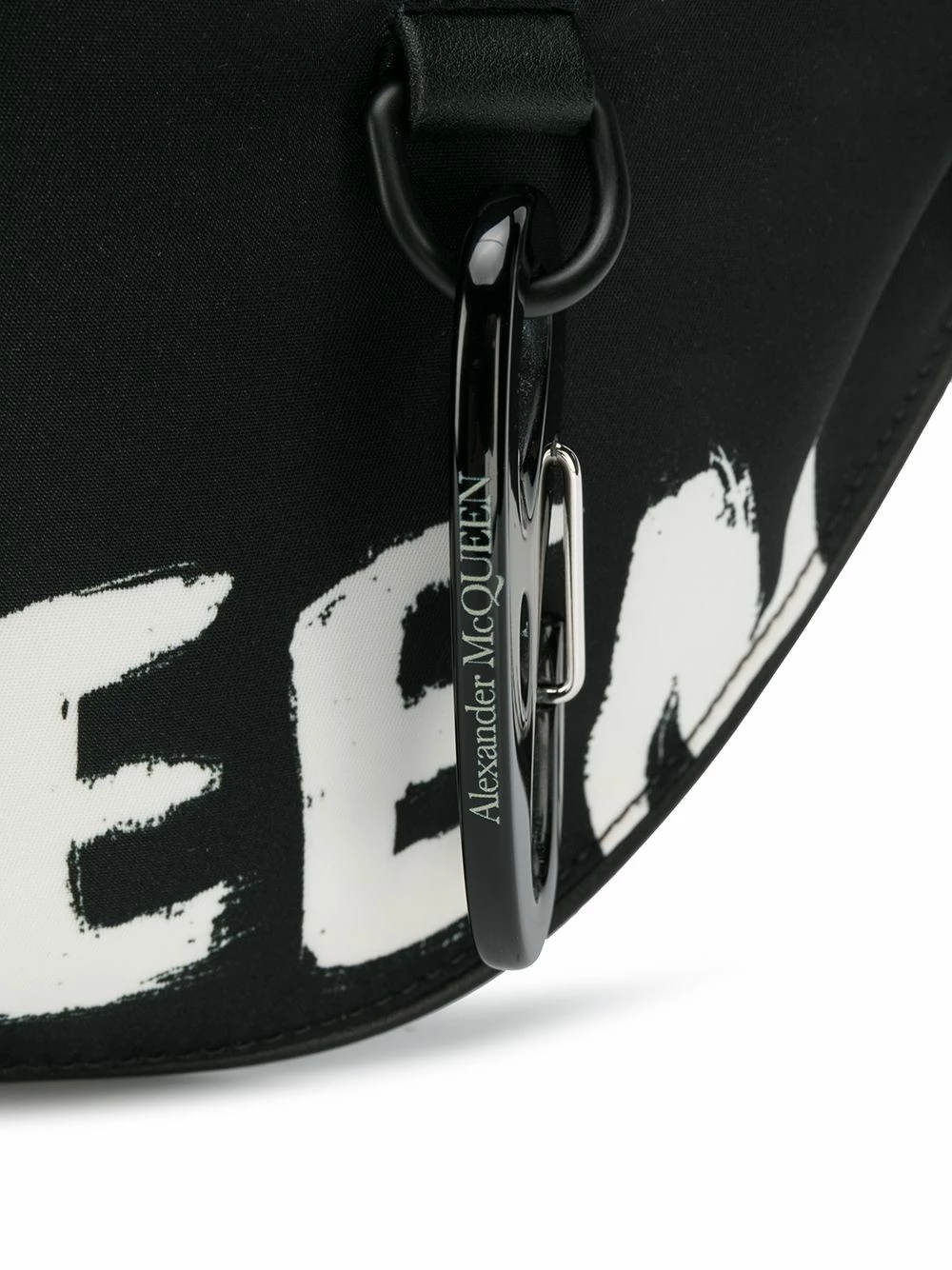 Get into your free-hands mode with this black Oversized Harness belt bag from Alexander McQueen – your hands should be free so you can hug people. Yes, we know you’re a hugger. Featuring a front zip fastening, a main internal compartment, an adjustable fit, a black-finished fish hook clasp on the front and a white printed McQueen graffiti signature to the front.