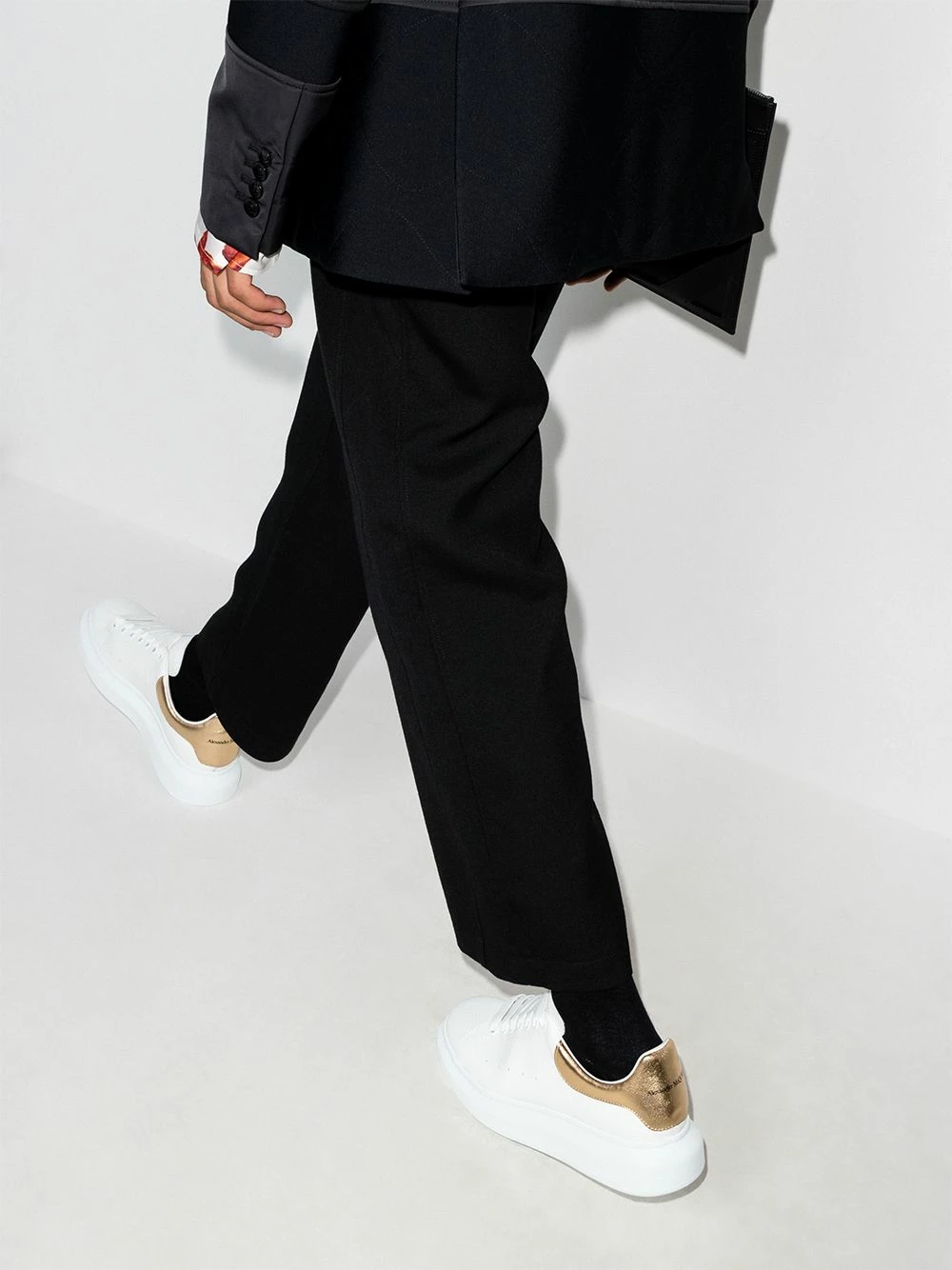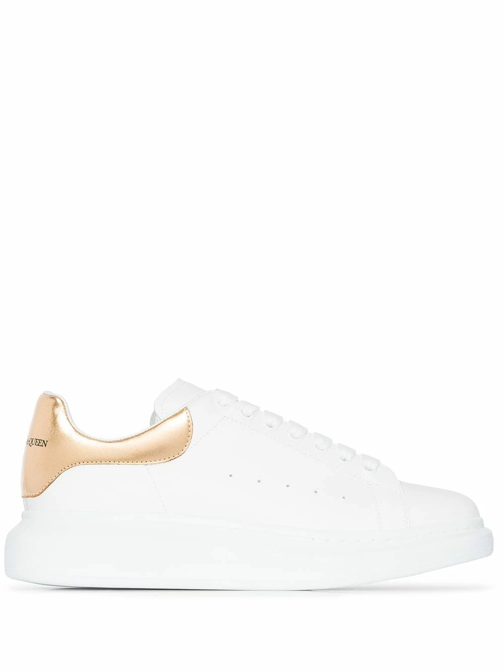 White leather oversized sneakers from Alexander McQueen featuring a round toe, a lace fastening, a brand embossed tongue and a contrasting heel counter. ALEXANDER MCQUEEN won’t provide dust bags to sneakers anymore.