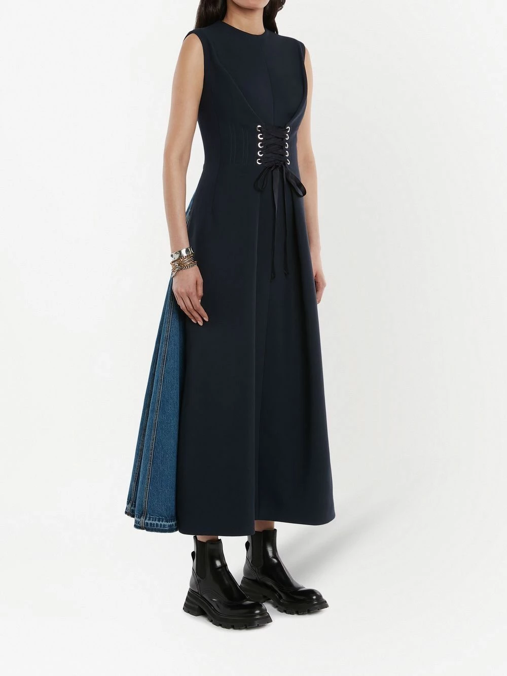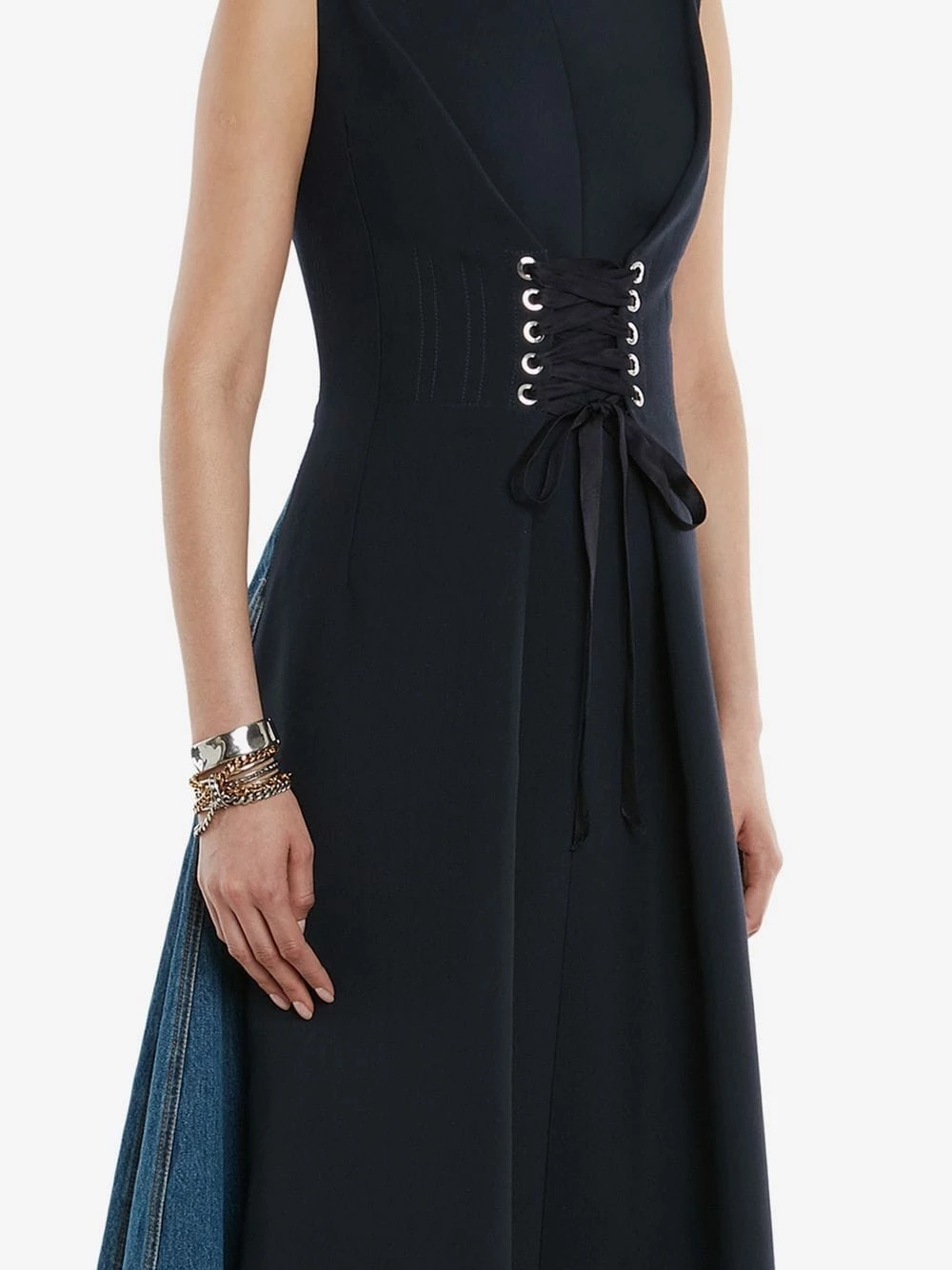Combining panels of blue denim with scuba fabric, this flared dress from Alexander McQueen has a hybrid look. The mid-length design is cinched-in at the waist with a lace-up corset, detailed with silver-tone eyelets.