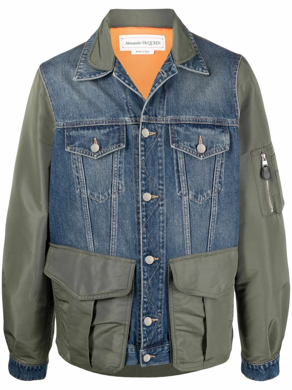 Alexander McQueen never fails to give modern twists to classic silhouettes. In a panelled design, this denim jacket features green contrasting panels and multiple extra pockets.