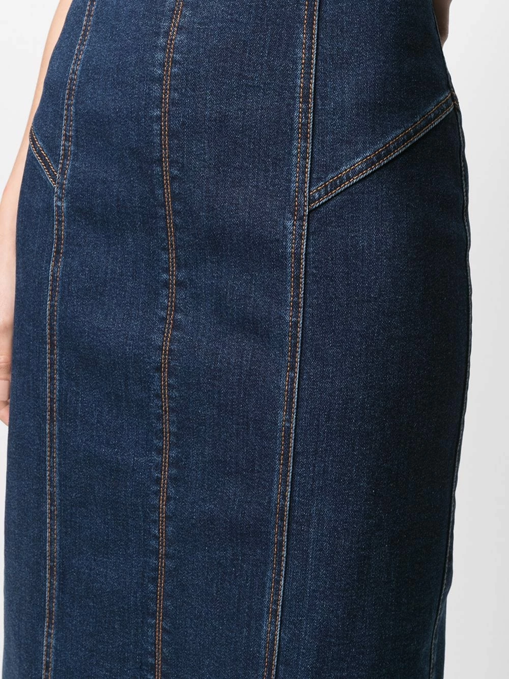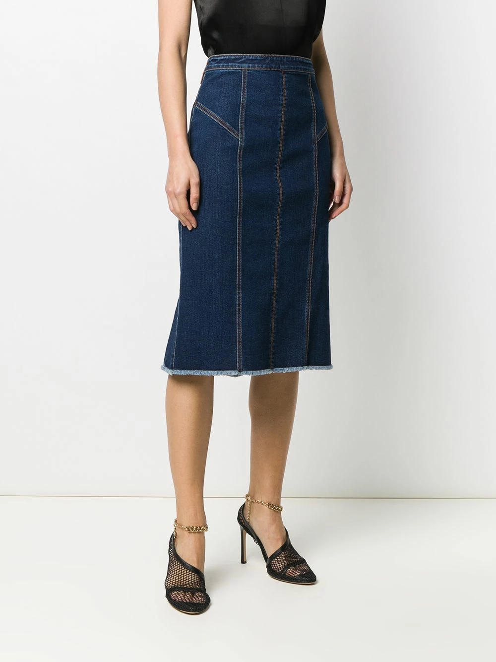 Swap out your usual jeans for some pretty denim. This blue stretch cotton-denim panelled mid-length denim skirt from Alexander McQueen reveals a ruffle hem on the rear. It deserves pride of place in your wardrobe.