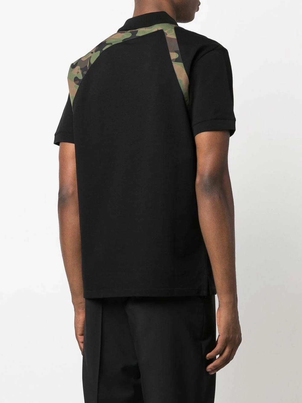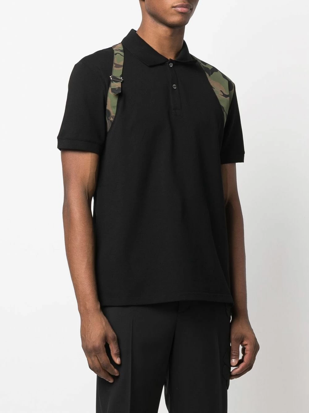 A polo shirt with a difference. This iteration from Alexander McQueen combines black cotton with green camouflage-print panelling and a strap detail on one side for an asymmetric aesthetic.
