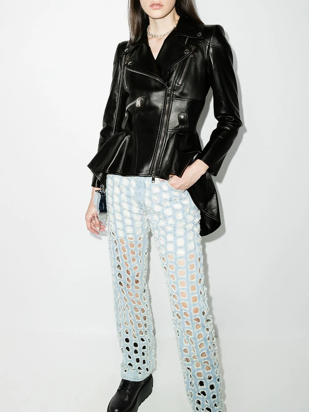Biker jacket but make it glamorous. With an appealing peplum hem, this Alexander McQueen piece will ensure you add the right amount of glam to your days.Â