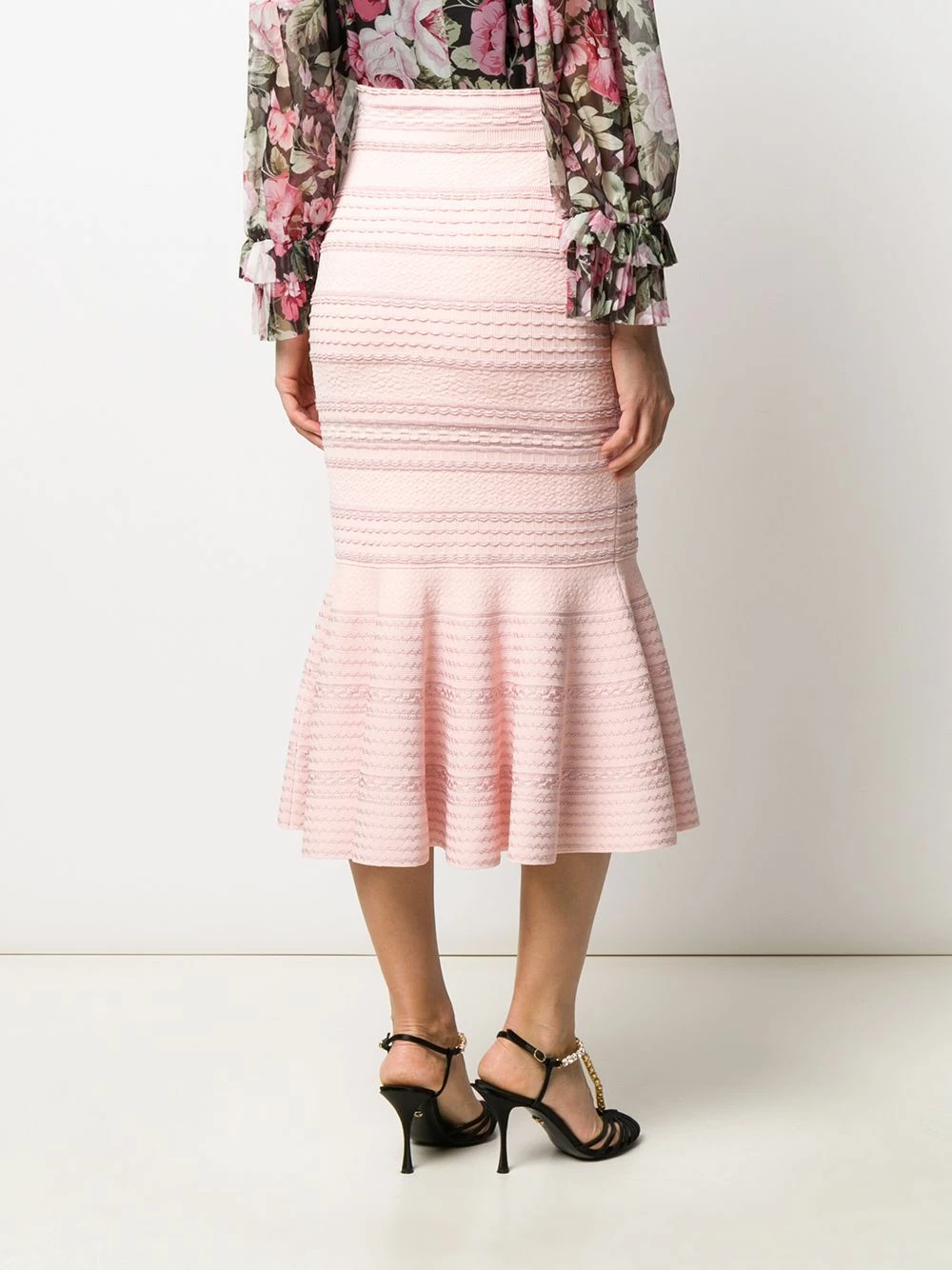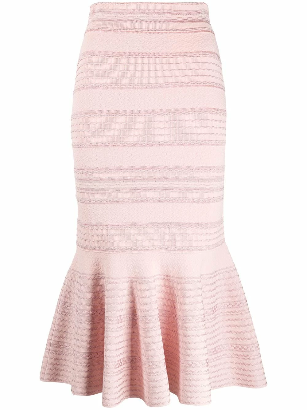 Want to be the person all eyes are on? Make a statement when you enter a room? Yes? You need this peplum hem midi skirt from Alexander McQueen. Beautifully elegant. Featuring a high waist, a slim fit, a textured style, scalloped details, a mid-length and a peplum hem.