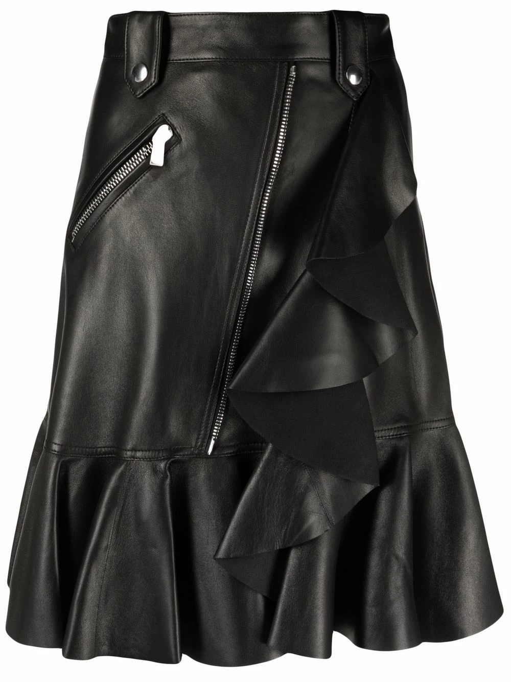 Taking a step away from its usual penchant for bold motifs and colourful patterns, Alexander McQueen’s AW21 collection focuses on luxurious materials and intricate cuts. This mini-length skirt perfectly exemplify that through its peplum silhouette, layered details and soft leather construction.