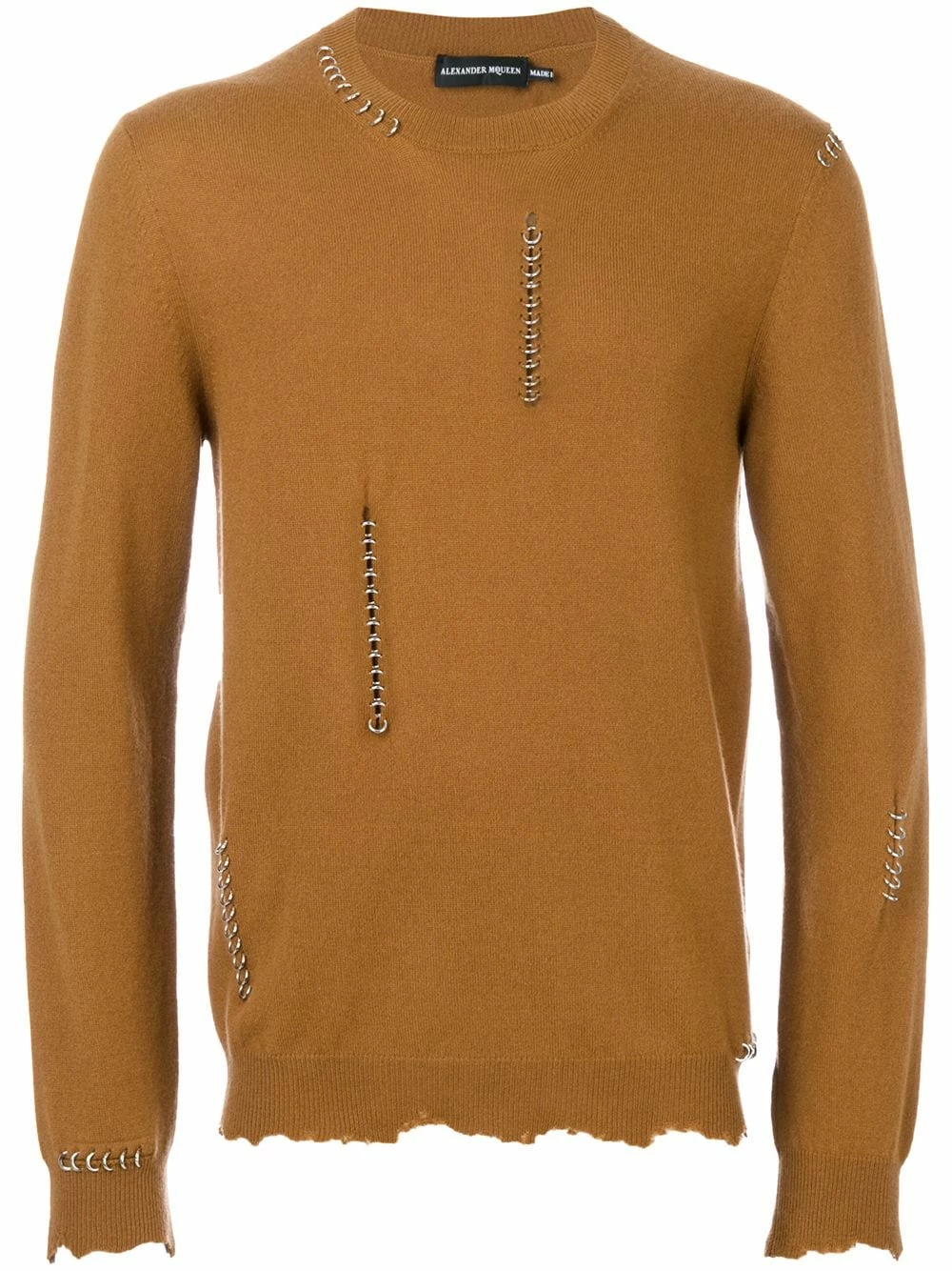 With a nod to Alexander McQueen’s rebellious aesthetic, this brown cashmere and wool blend jumper includes a ribbed crew neck, long sleeves and a ribbed hem and cuffs. This grunge-inspired piece from Alexander McQueen will be the perfect finishing touch to pared-back, off-duty ensembles.