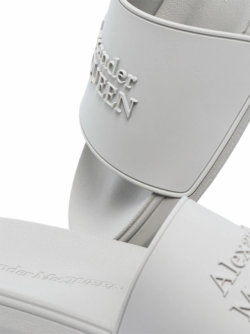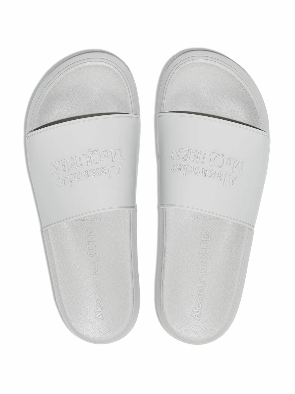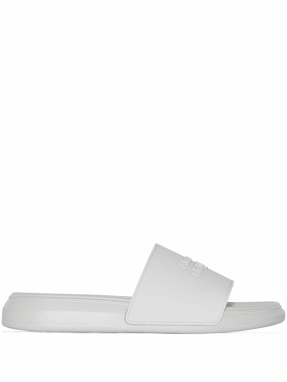 Stepping down from its usual exuberant aesthetic, Alexander McQueen presents the Pool slides. Made of rubber for a water-resistant finish in a versatile grey hue, this pair is decorated with a tonal raised logo at the toe strap for an instantly recognisable look.