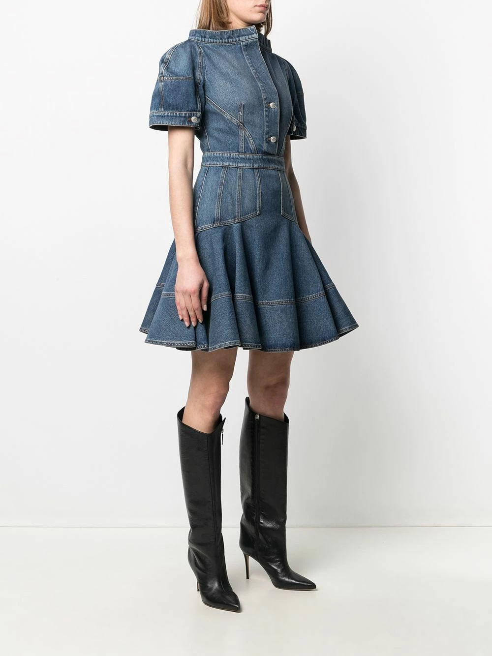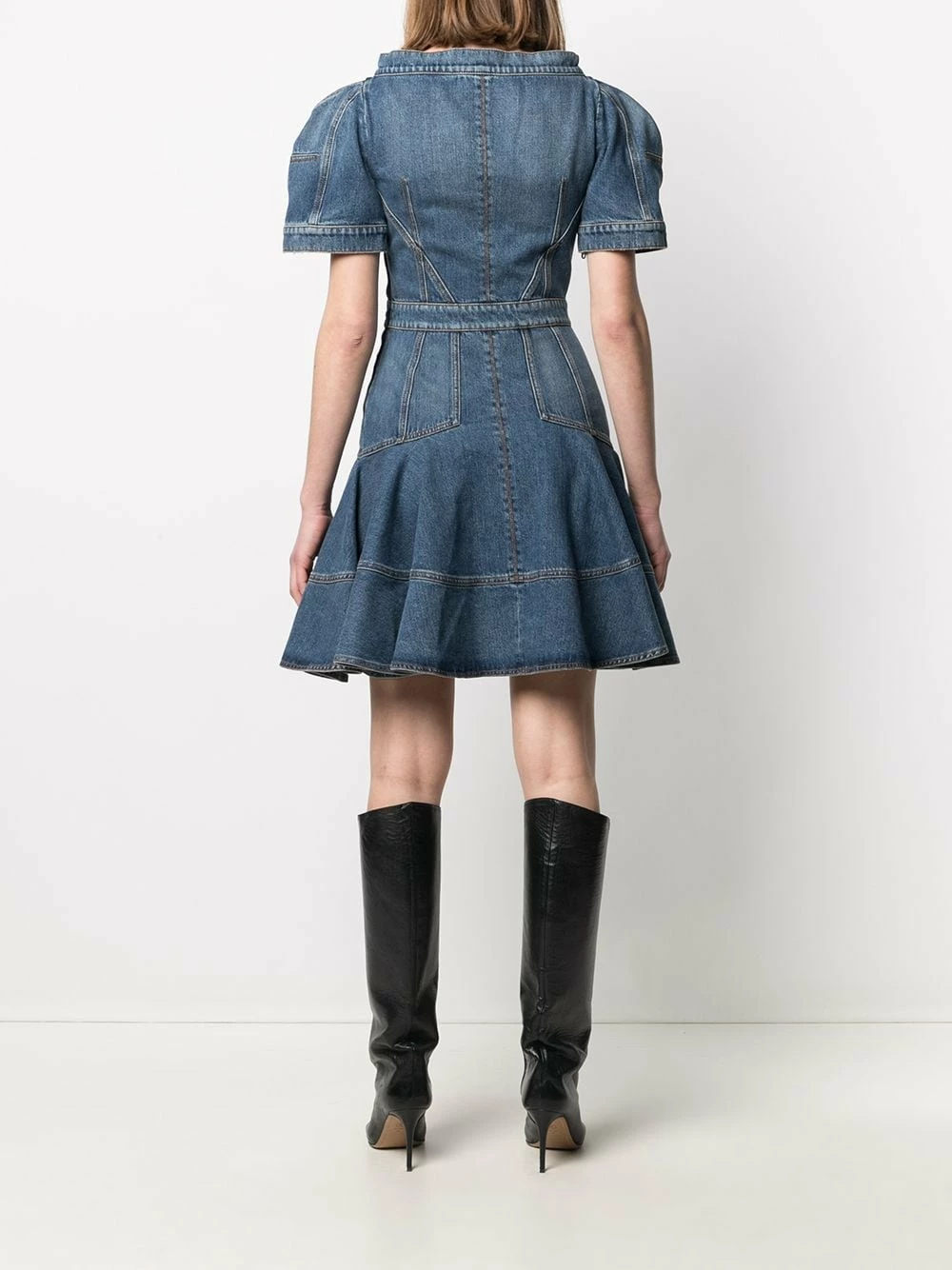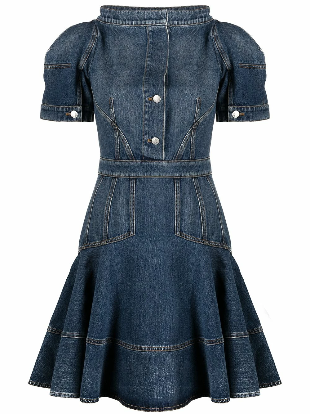 Trust Alexander McQueen to reinvent a classic. This denim dress comes with short puff sleeves and a flared skirt for a bold look. Dare to wear it.