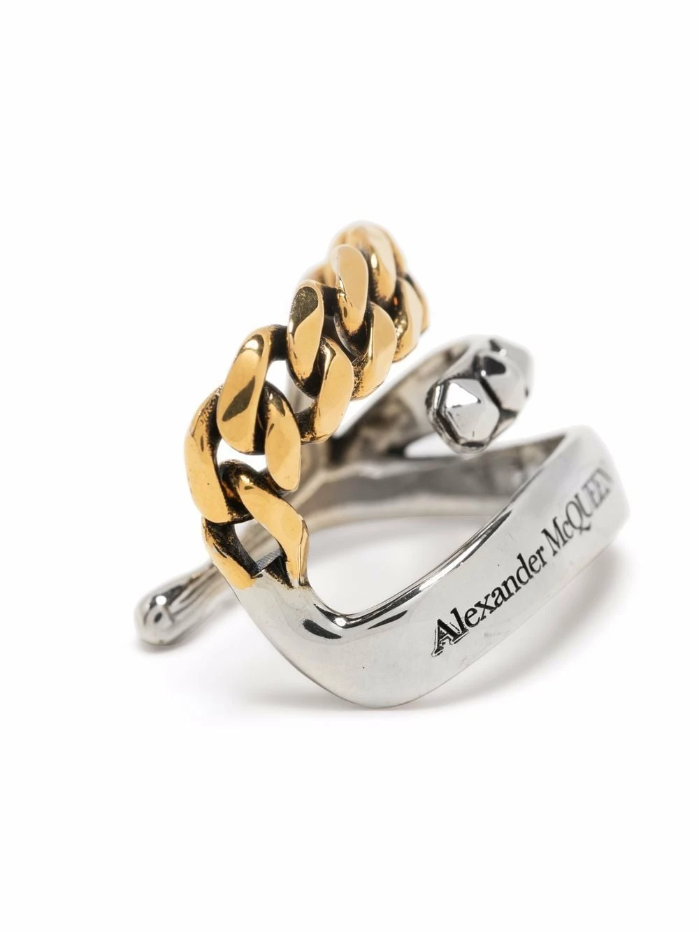 Finished with an antique effect, this ear cuff celebrates Alexander McQueen’s punk aesthetic. Suitable for non-pierced-ears, this piece is detailed with small studs and an engraved logo.