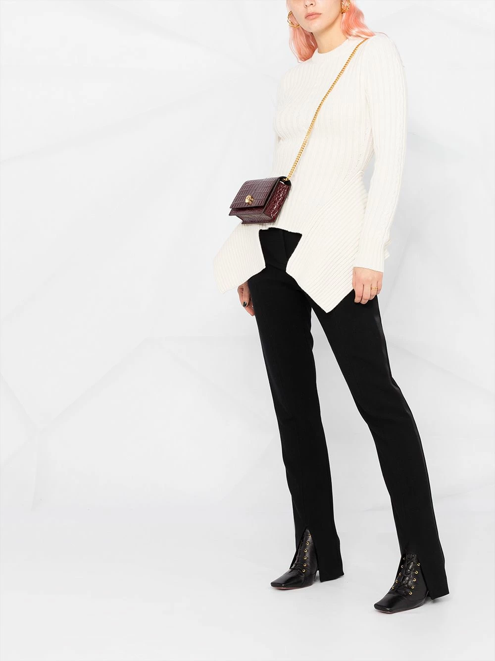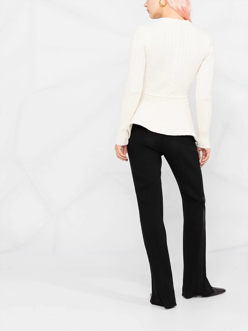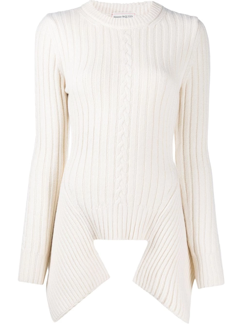Next level knitwear. Alexander McQueen takes your winter layering to new heights with this ribbed jumper, featuring cable knit panels and an asymmetric hem. Warmth and style.Â