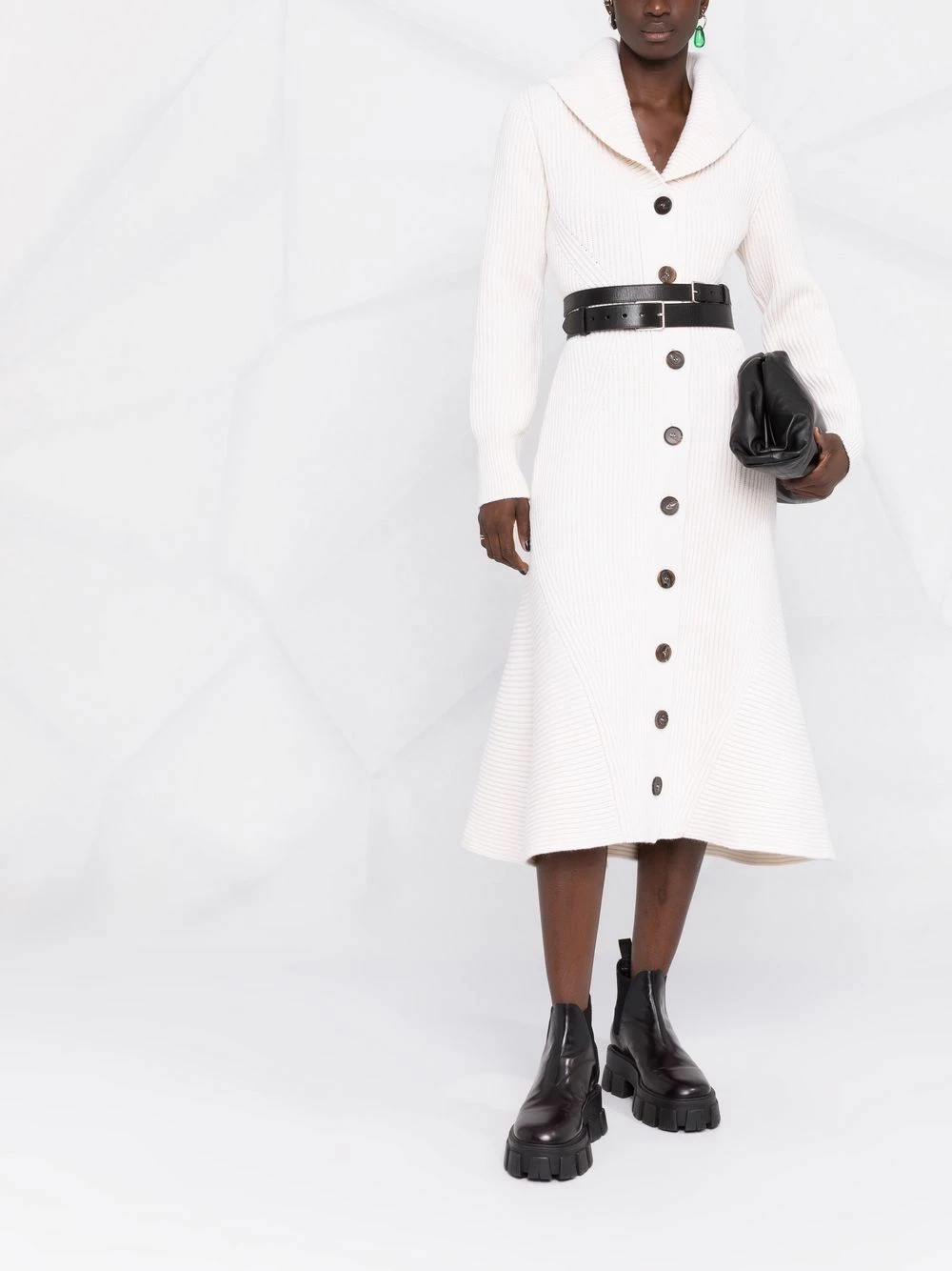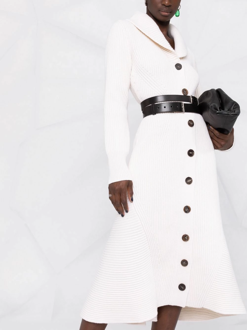 Crafted from a blend of wool and cashmere, this knitted dress from Alexander McQueen has been designed with comfort in mind. Its ribbed-knit construction opens up to a flared hem that adds to the refined feel.