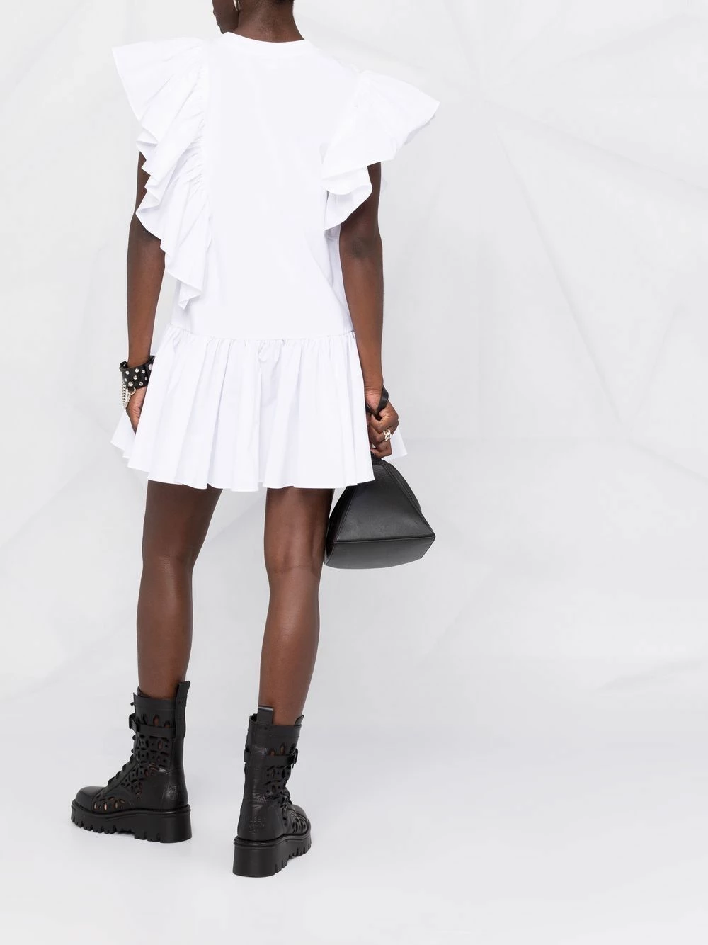 Detailed with gentle ruffles and a small cut-out detail on a single shoulder, this white cotton dress from Alexander McQueen falls to a playful short length.