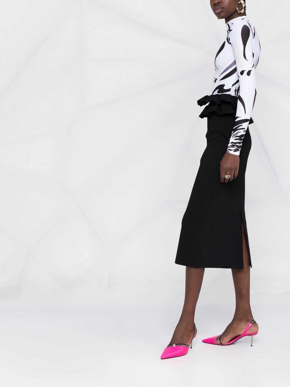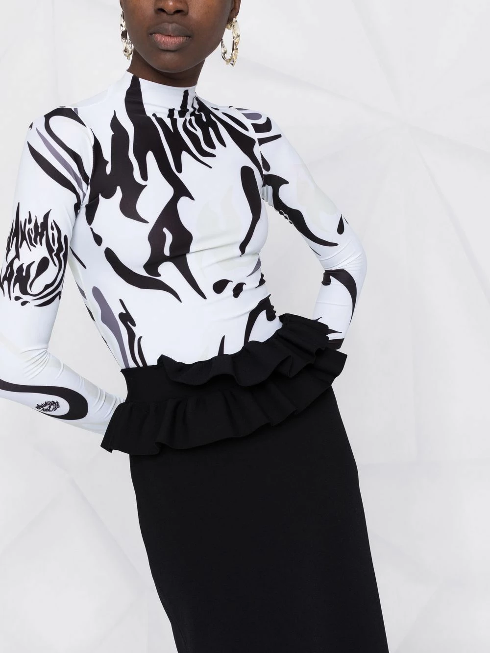 Following the usual brand’s dark tones, this Alexander McQueen skirt appears in black. The design features a sleek straight cut while ruffles around the waist add a bold touch.Â