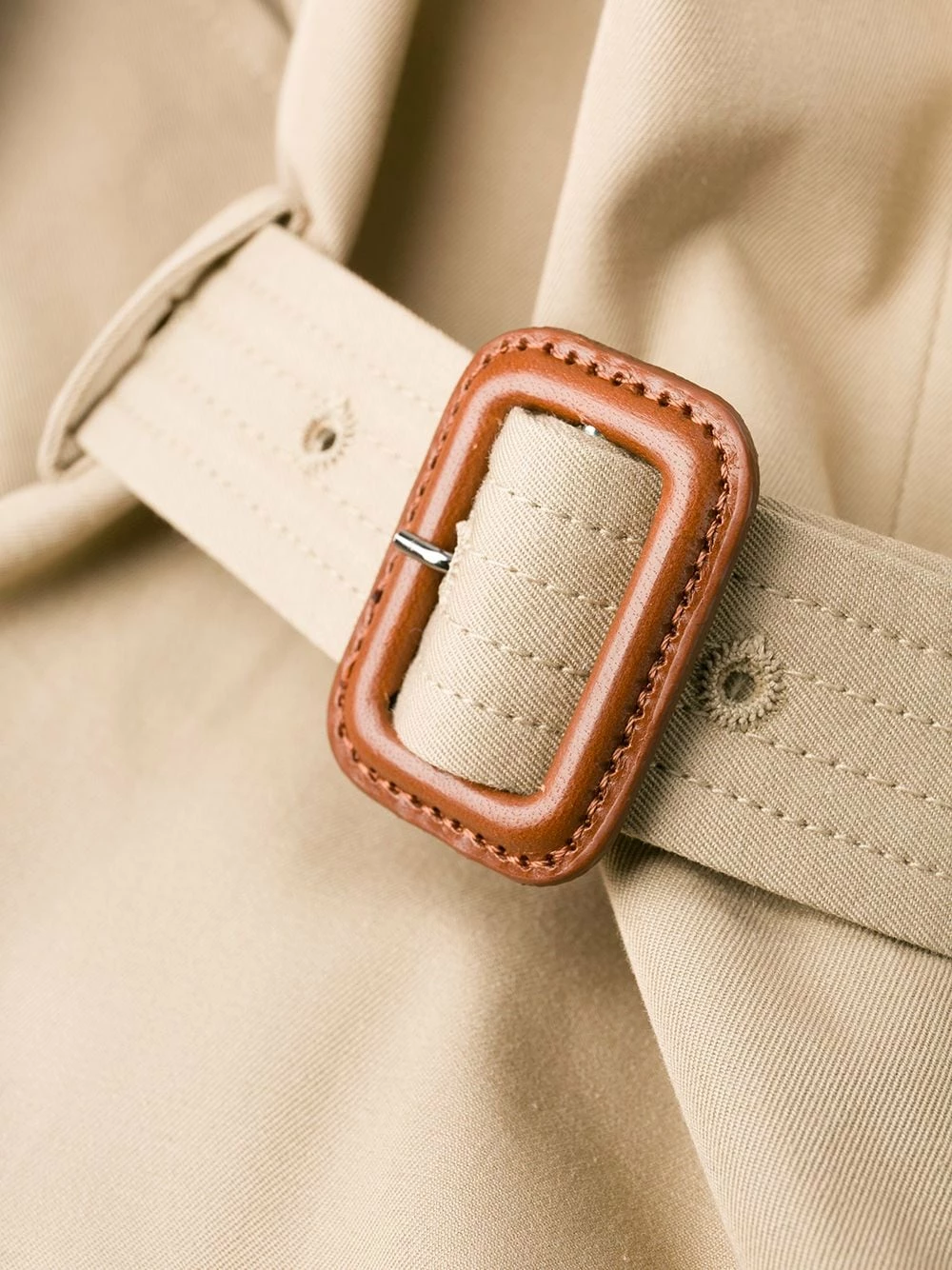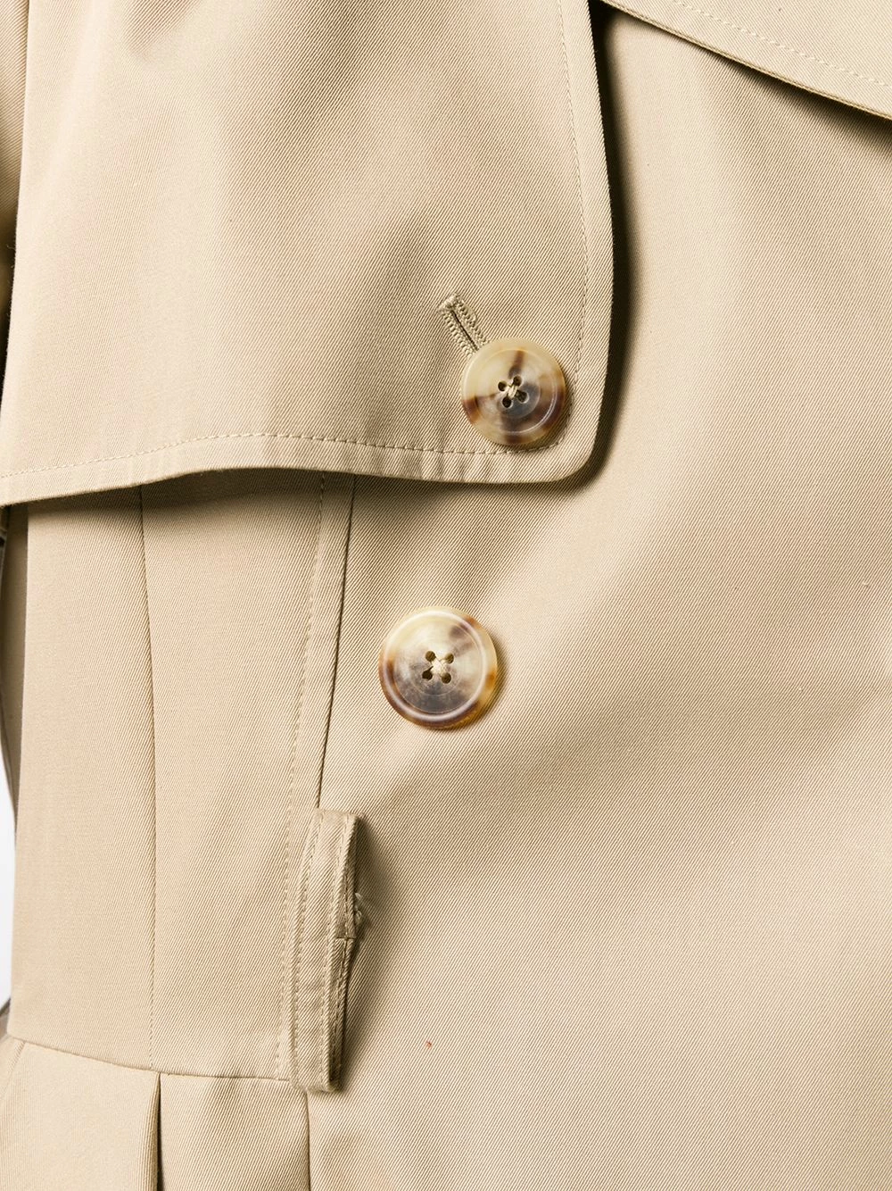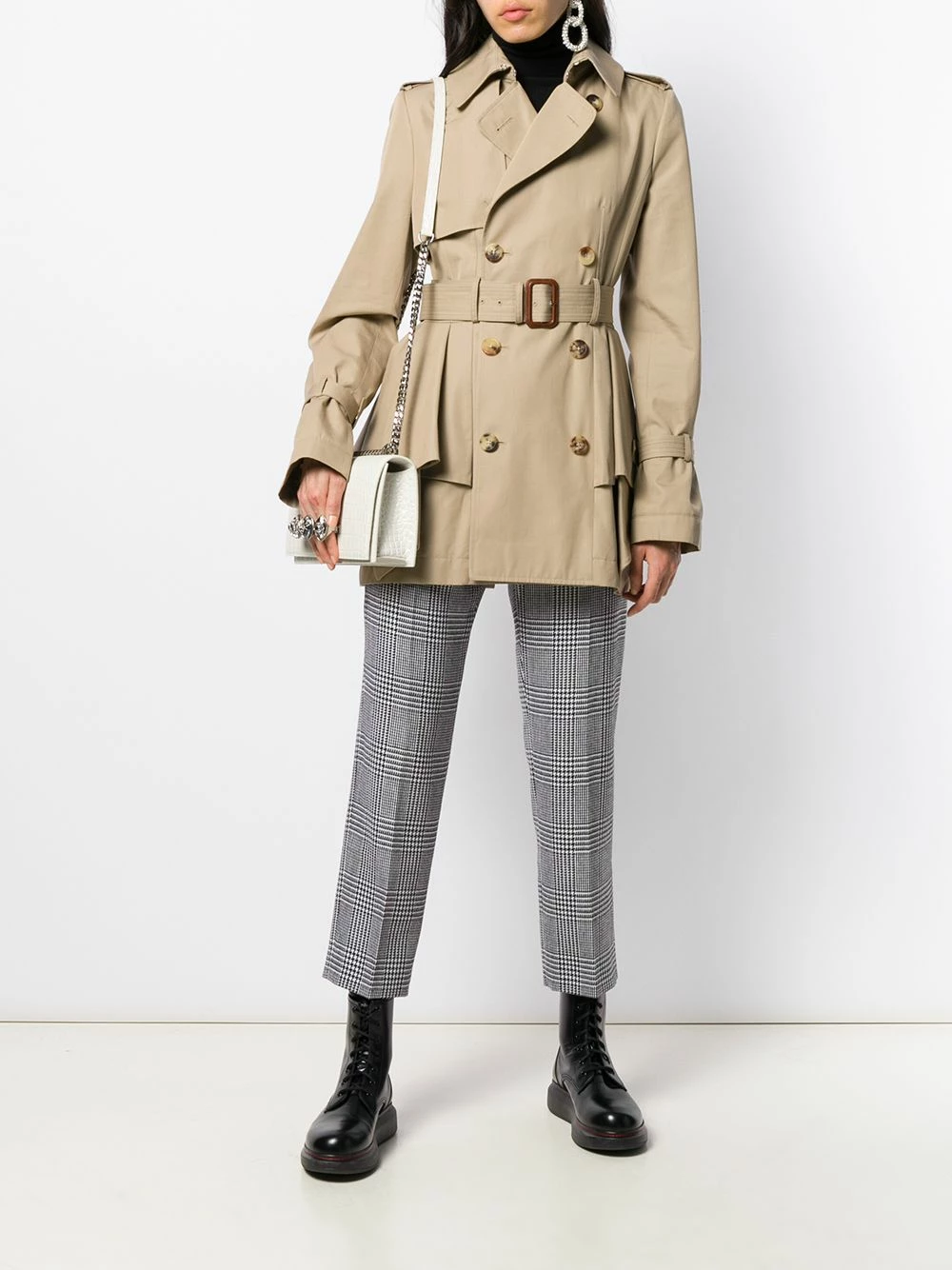 Restlessly inserting light punk rock references to traditional pieces, Alexander McQueen is the place of birth of attitude and statements, as seen in this beige cotton ruffle detail trench coat. Featuring notched lapels, epaulettes on the shoulders, long sleeves, a storm flap, a double breasted front fastening and a belted waist.
