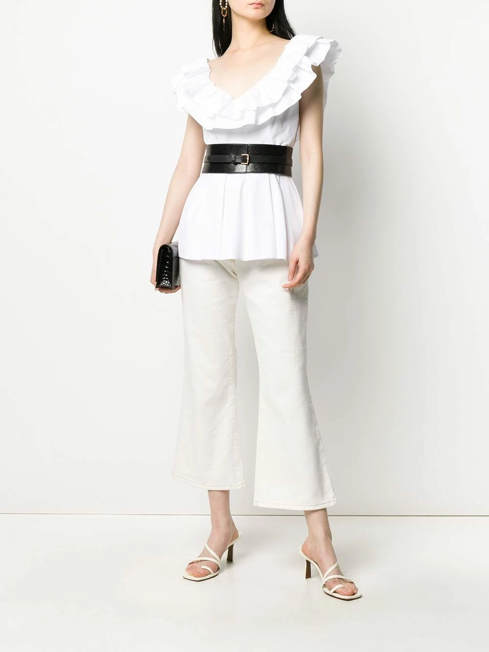 You’re not a dramatic person – your clothes, however, take centre stage. This white cotton ruffle peplum blouse from Alexander McQueen will give your looks all the theatricals it needs. Lights, camera, action! Featuring a scoop neck, a ruffle trimming, a peplum hem and a sleeveless design.