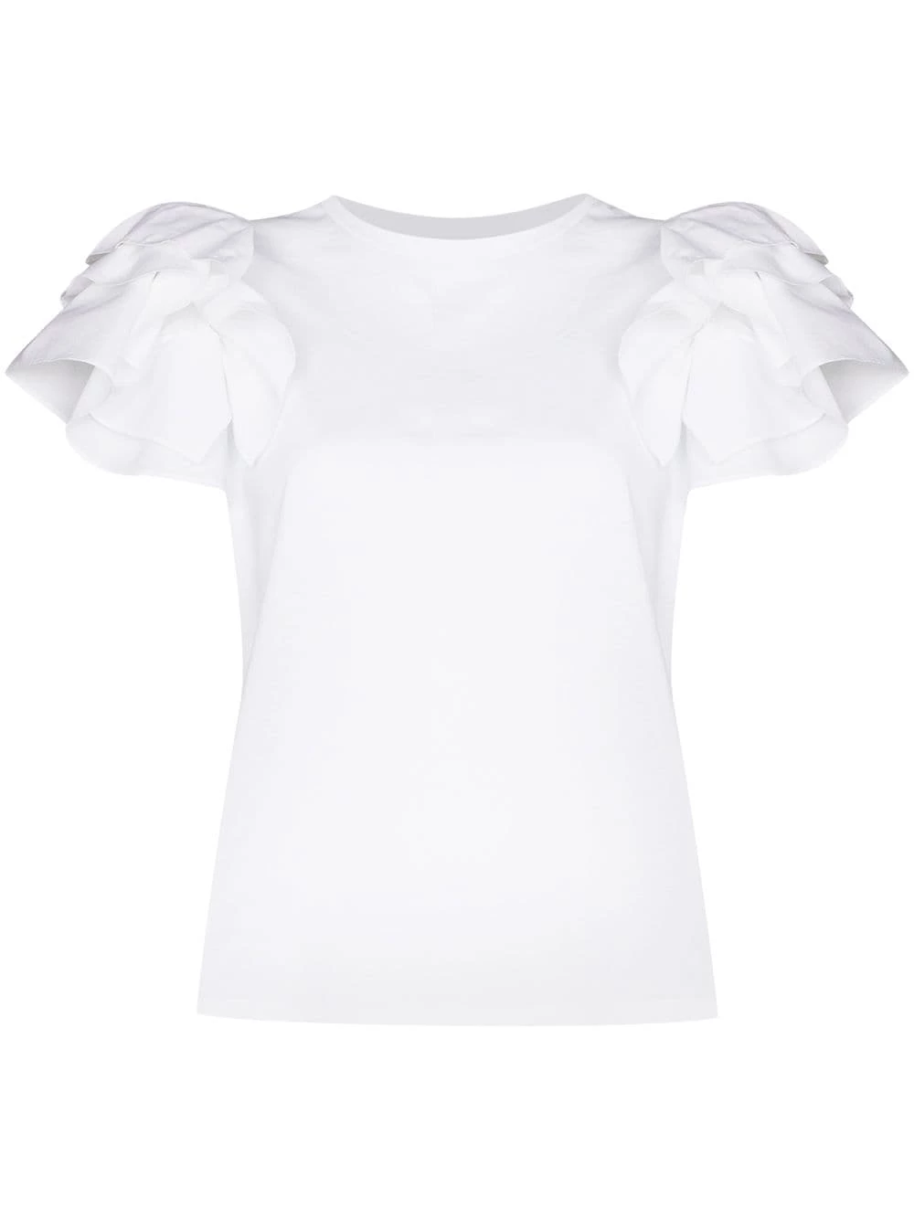Add a dash of fun to your attire. Throw on this optical white ruffle sleeve cotton T-shirt from Alexander McQueen, and it will do the rest. Good vibes here only.
