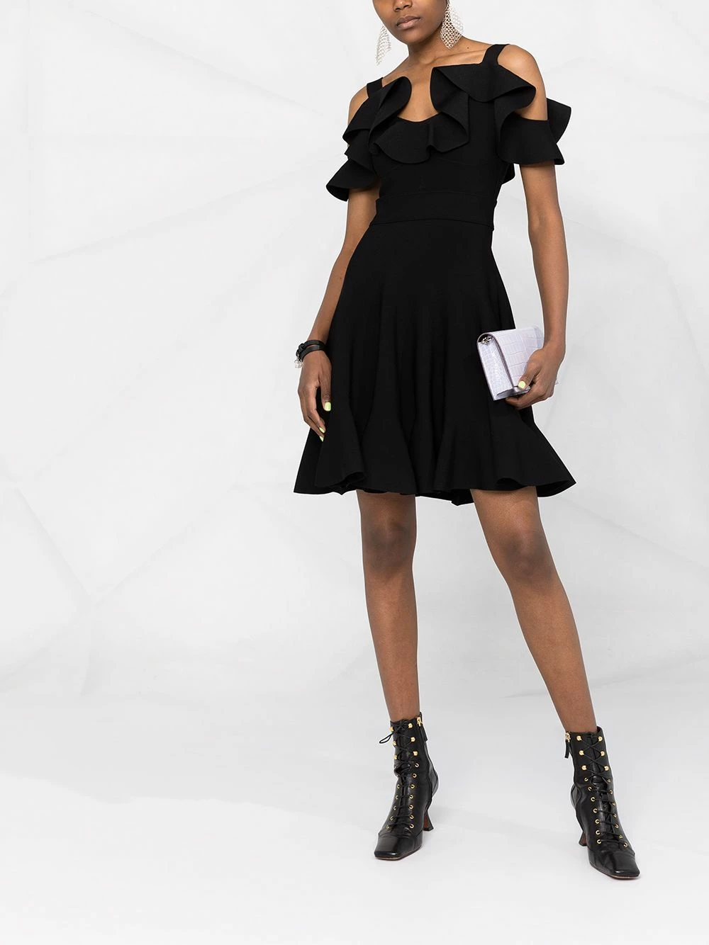 The ultimate LBD. In a deep black hue with a flared shape, this mini dress from Alexander McQueen is one for the history books. And your closet.