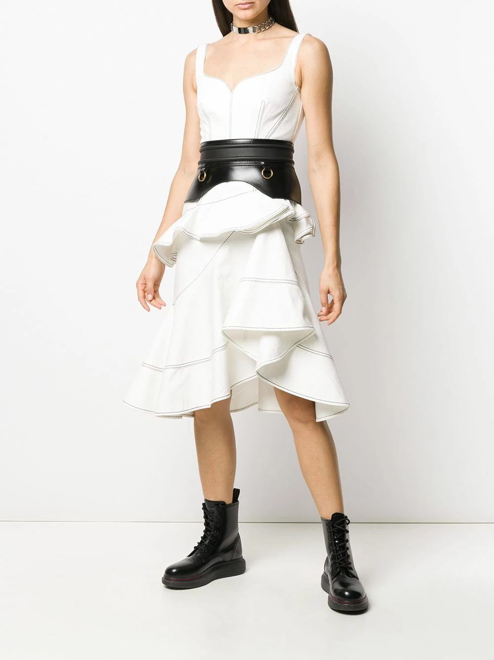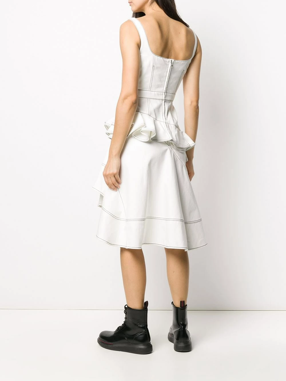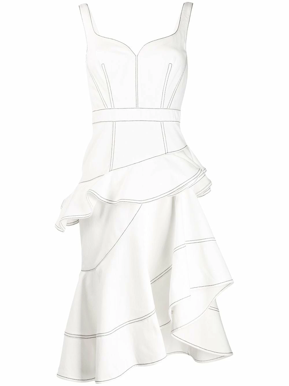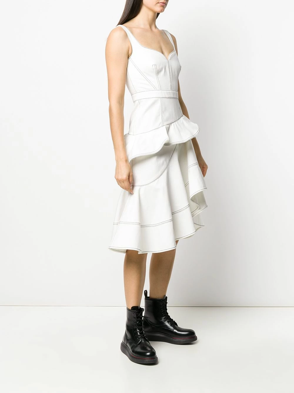Alexander McQueen began with the label’s founder working on Savile Row, so it’s no surprise the brand’s collections are immaculately tailored. Cut from white denim trimmed with contrasting stitching, it has a corset-inspired bodice and romantic ruffles at the skirt. Pretty as a picture. Featuring a sweetheart neckline, a ruffled design and an asymmetric hem.