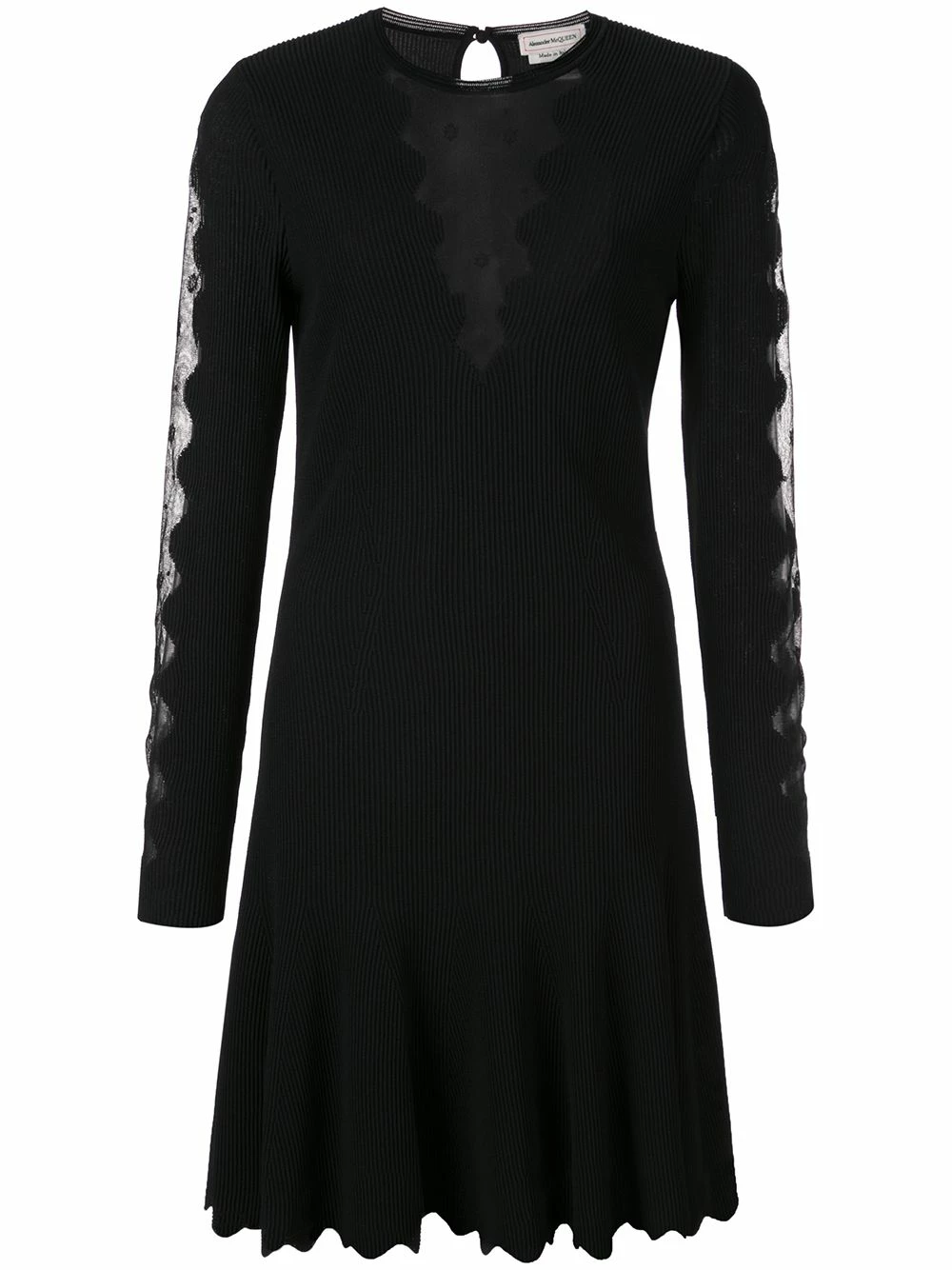The little black dress is a necessity. Opt for this darkly-alluring version from Alexander McQueen. It boasts scalloped mesh inserts and a flirty skater skirt. With it’s timeless shape and dark colourway, you’ll be reaching for this frock over and over again. Featuring a crew neck, long sleeves, a back button fastening and a flared skirt.