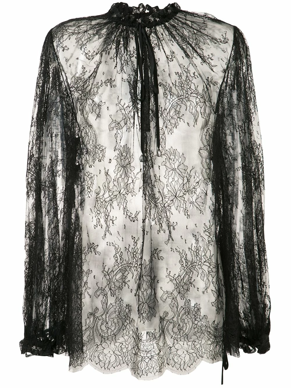 Black cotton blend sheer lace blouse from Alexander McQueen featuring a tied neckline, long sleeves and tied cuffs.