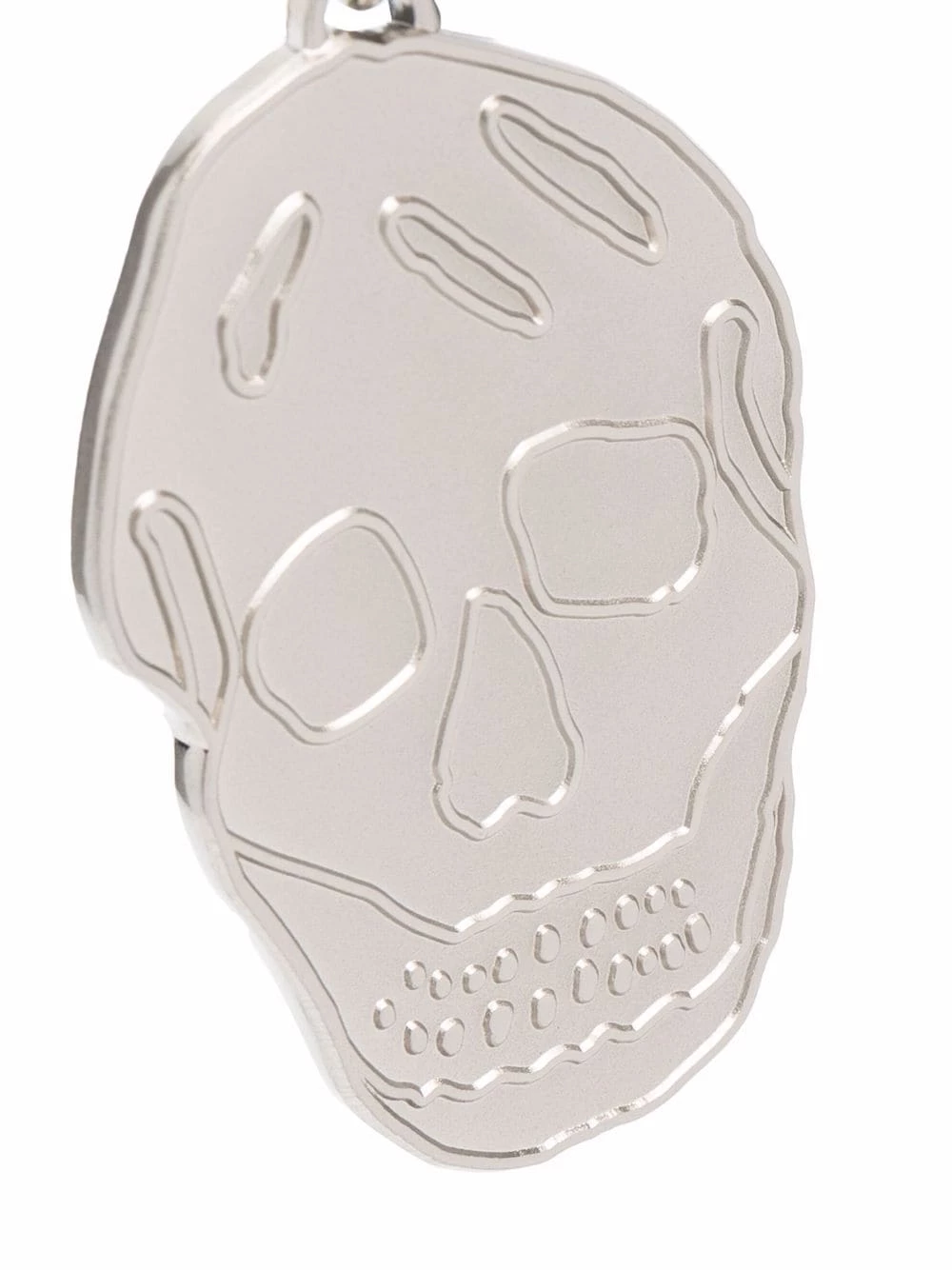 Silver-tone metal signature skull keyring from Alexander McQueen featuring skull print, silver-tone hardware and keyring attachment.