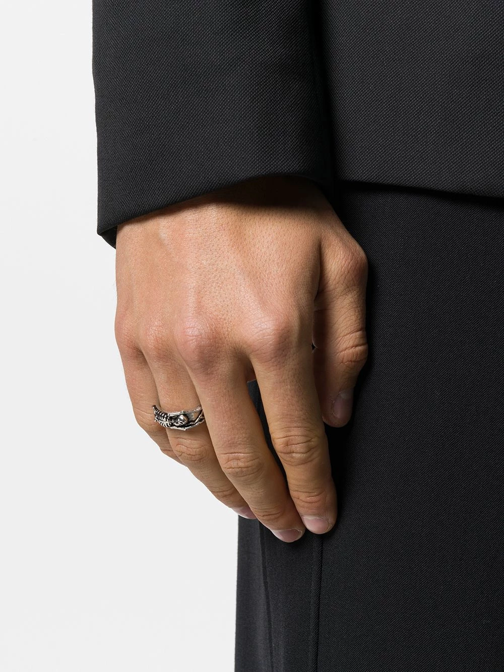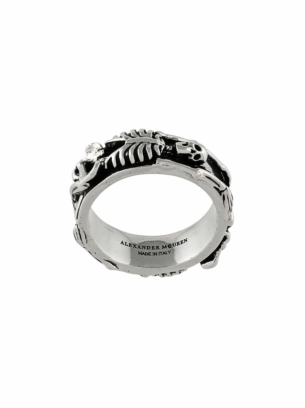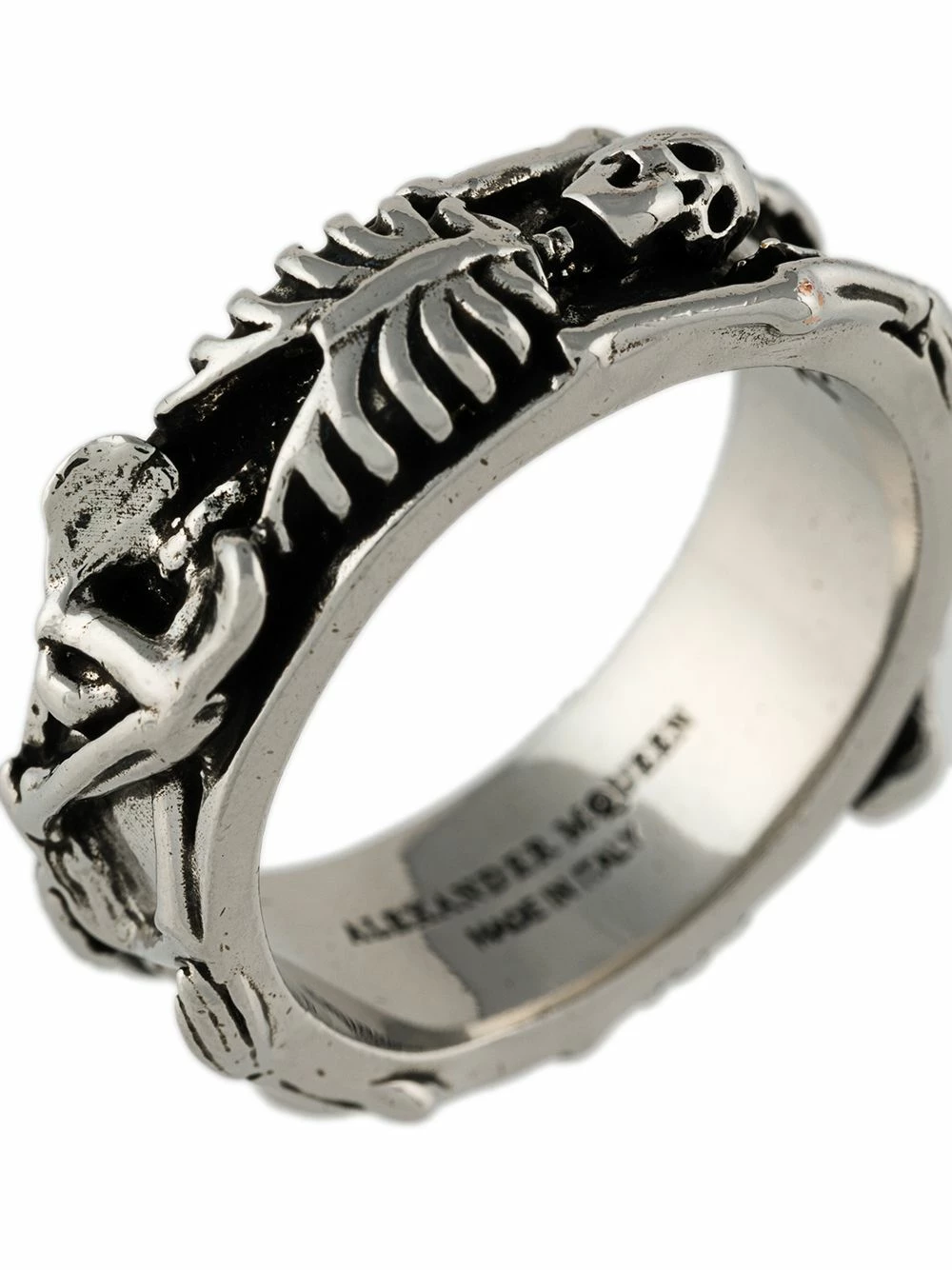 Incorporate Alexander McQueen’s signature skull motif into every day looks with this iconic skull ring. The accessory was fabricated in Italy from silver-tone brass, and features a centred embossed skeleton around its shape.