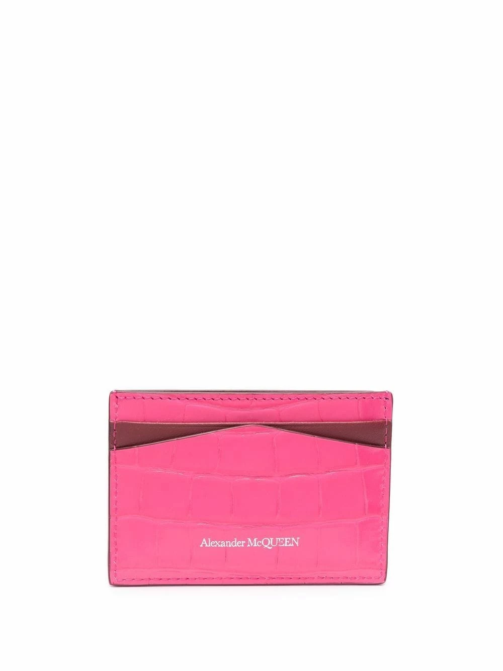 Hot-pink leather skull-appliqué leather cardholder from Alexander McQueen featuring embossed crocodile effect, skull appliqué, embossed logo to the front and card slots.