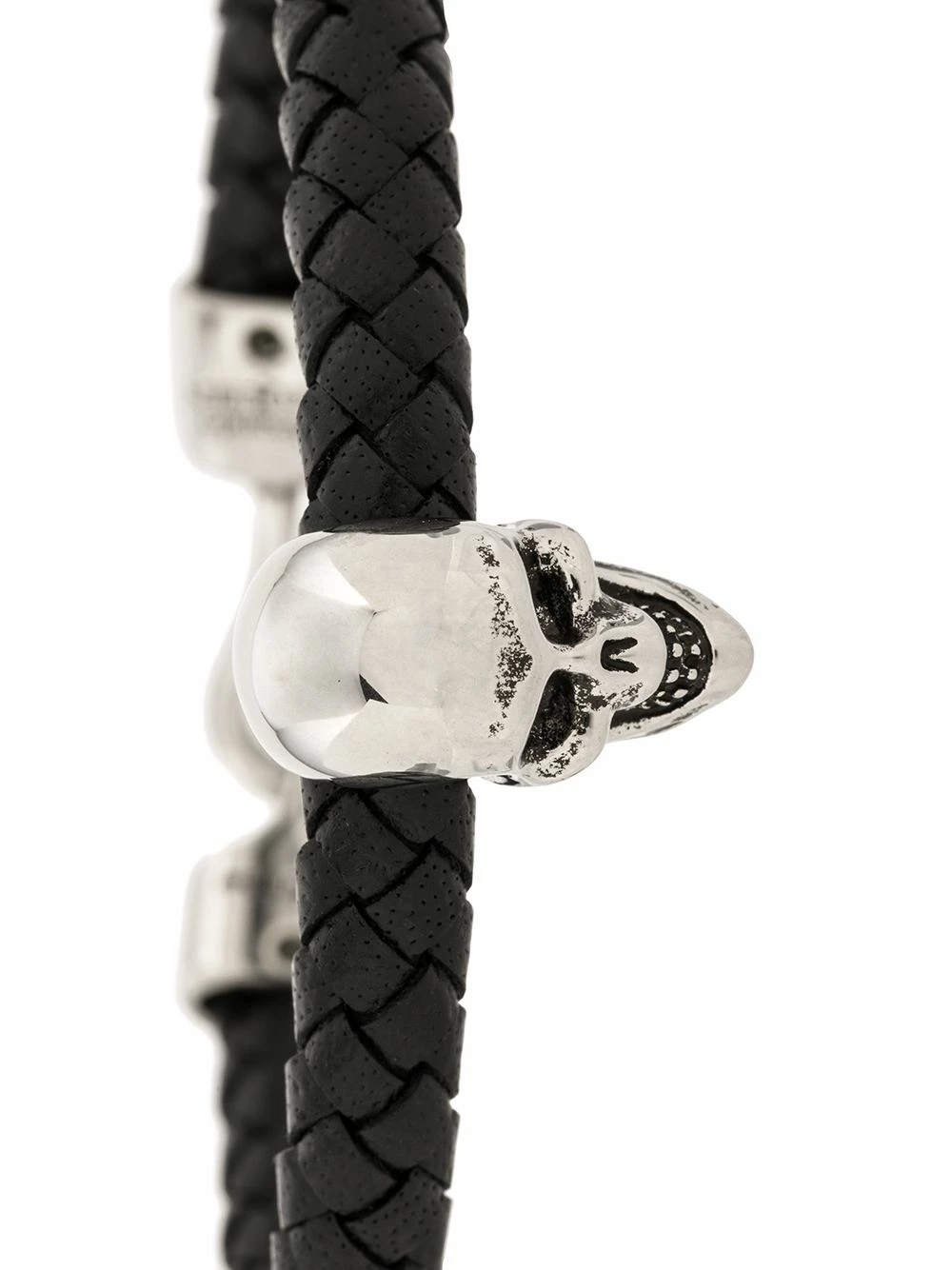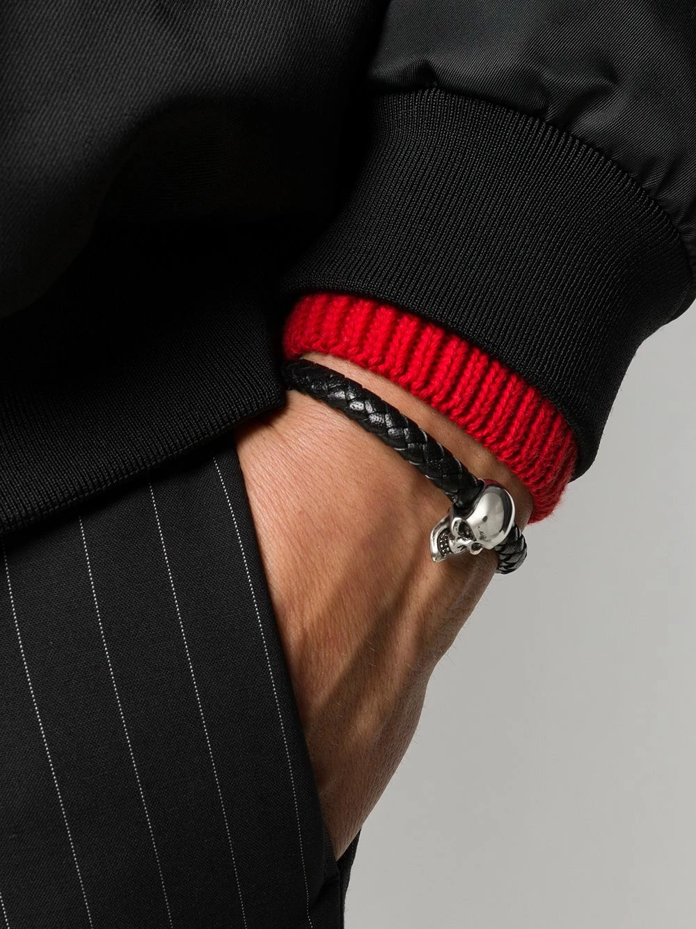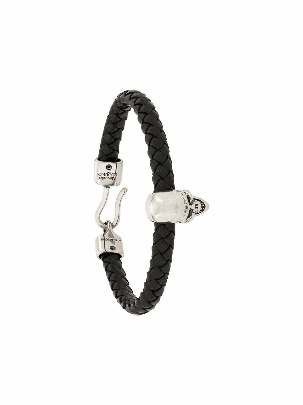 Lose track of time. Replace your boring watch with this black leather and brass skull charm braided bracelet from Alexander McQueen. It’s not like you’re usually on time, anyways. Featuring silver-tone hardware, a fishhook fastening, a signature skull charm and a braided detail.