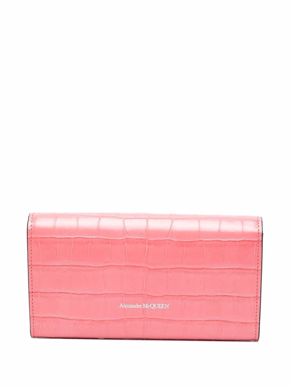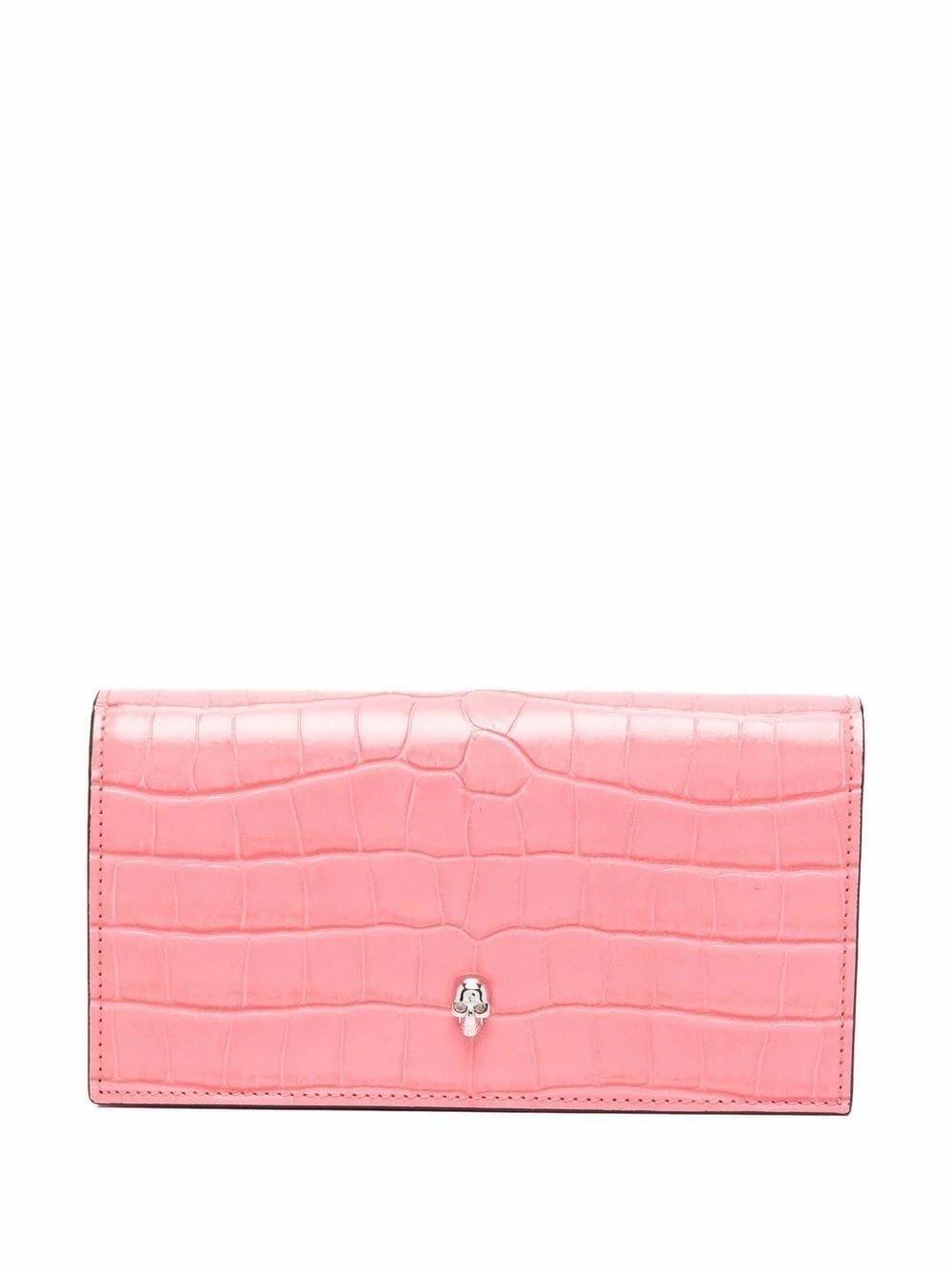 Coral-pink leather skull croc-effect wallet from Alexander McQueen featuring skull stud detailing, crocodile effect, logo lettering, foldover top with press-stud fastening, internal card slots and internal zip-fastening pocket.