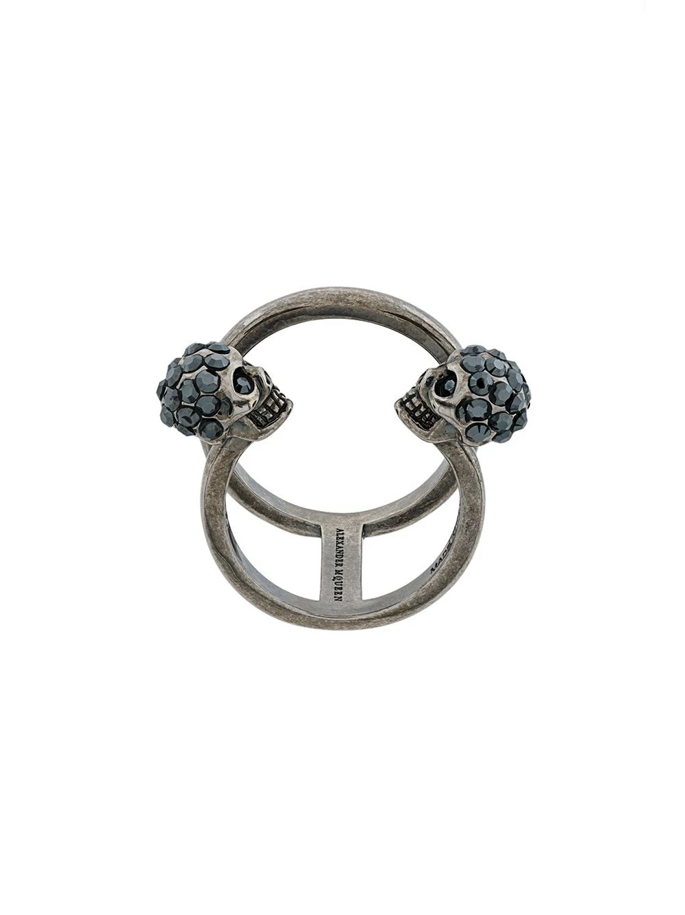 Alexander McQueen adds its signature rockstar edge to not only its clothing but jewellery for the new season. this metallic glass skull cuff ring from Alexander McQueen is constructed with antique effect silver-tone hardware and embellished skull detail.