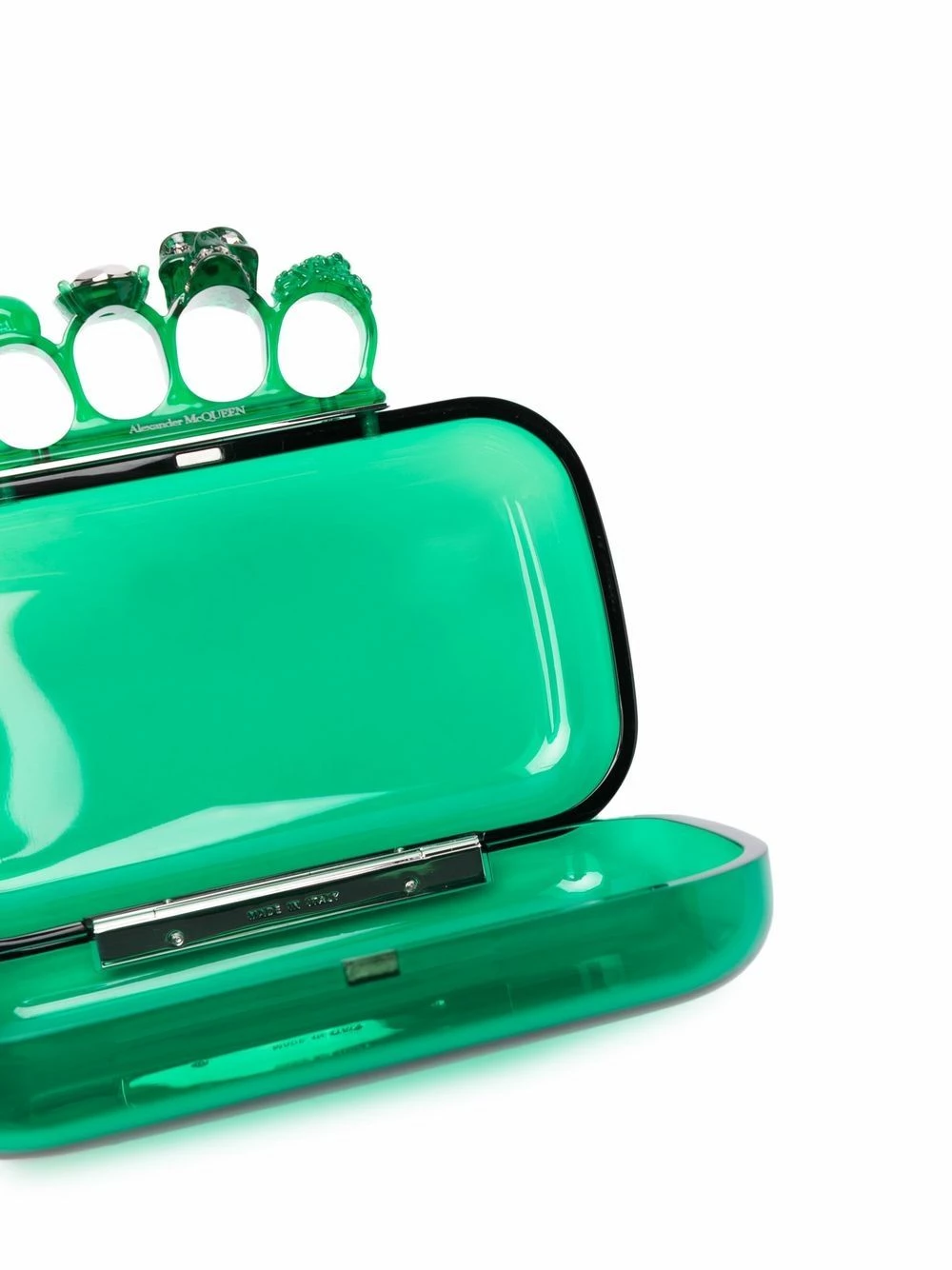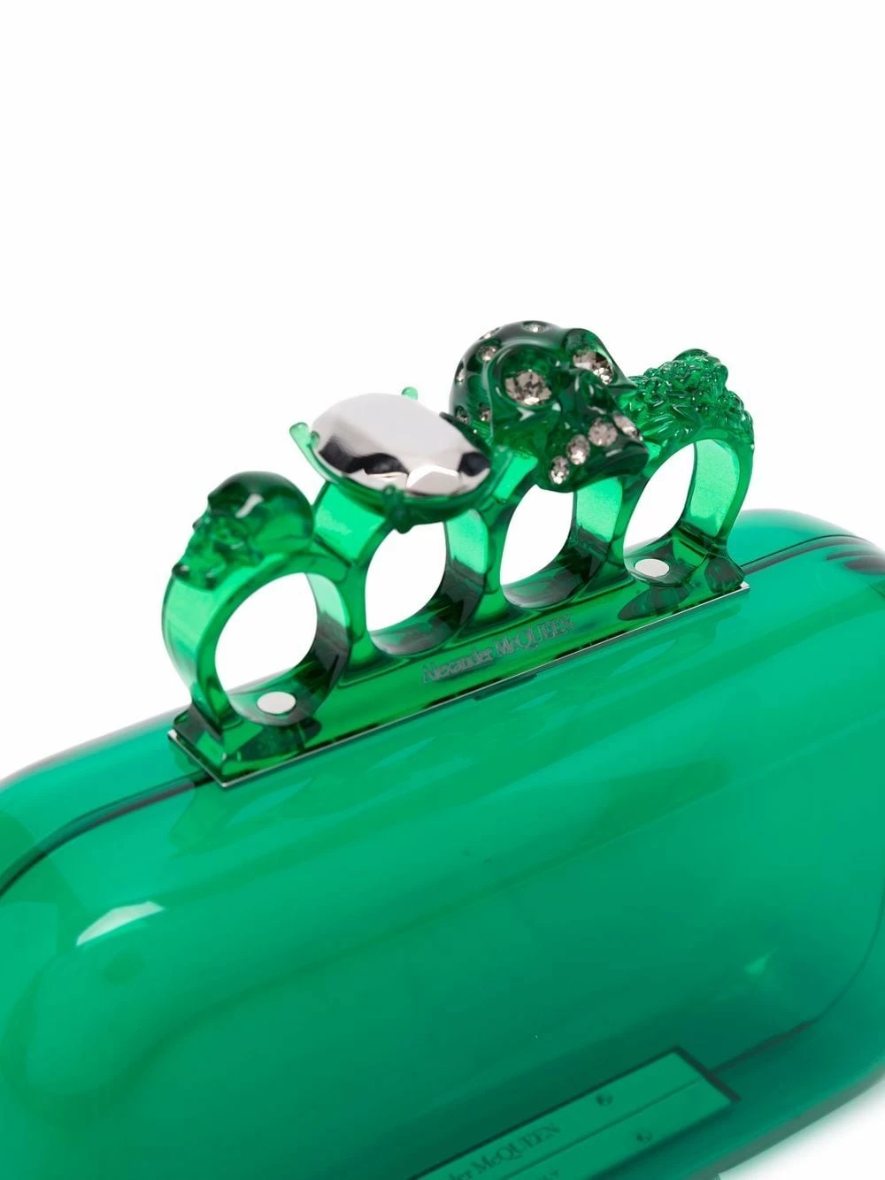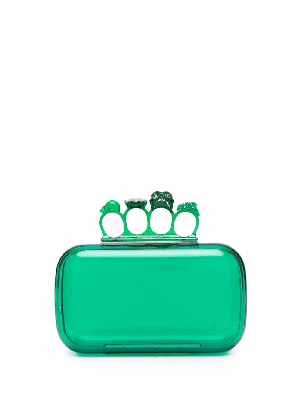 Alexander McQueen’s Skull Four-Ring clutch is among the brand’s best-loved styles. This green partially transparent iteration will add a flash of colour to any outfit. Notice the Swarovski crystals decorating the signature skull motif at the top.