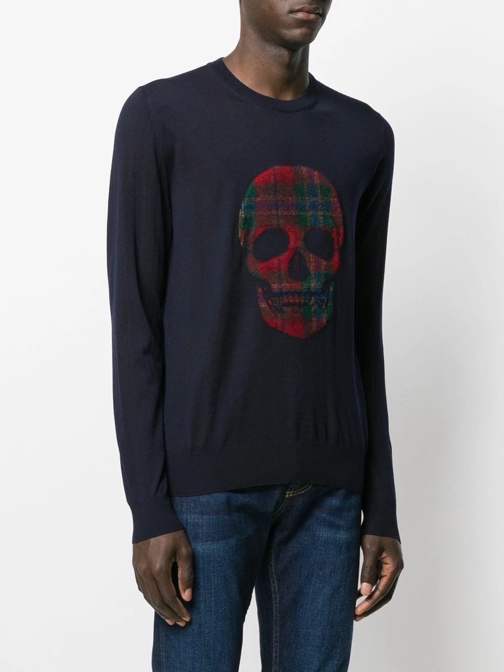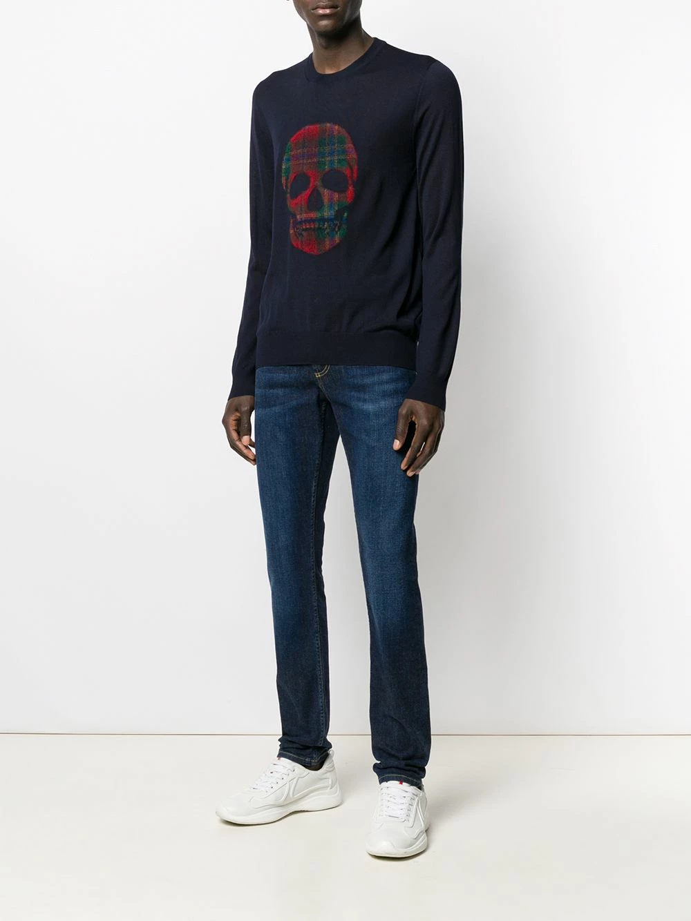 Discover the darkly alluring aesthetic of Alexander McQueen in the latest collection. Theatrical designs feature intricate, opulent detailing and gothic motifs like this wool skull motif sweater. Featuring a ribbed round neck, long sleeves, a ribbed hem and cuffs and a tartan skull motif to the front.