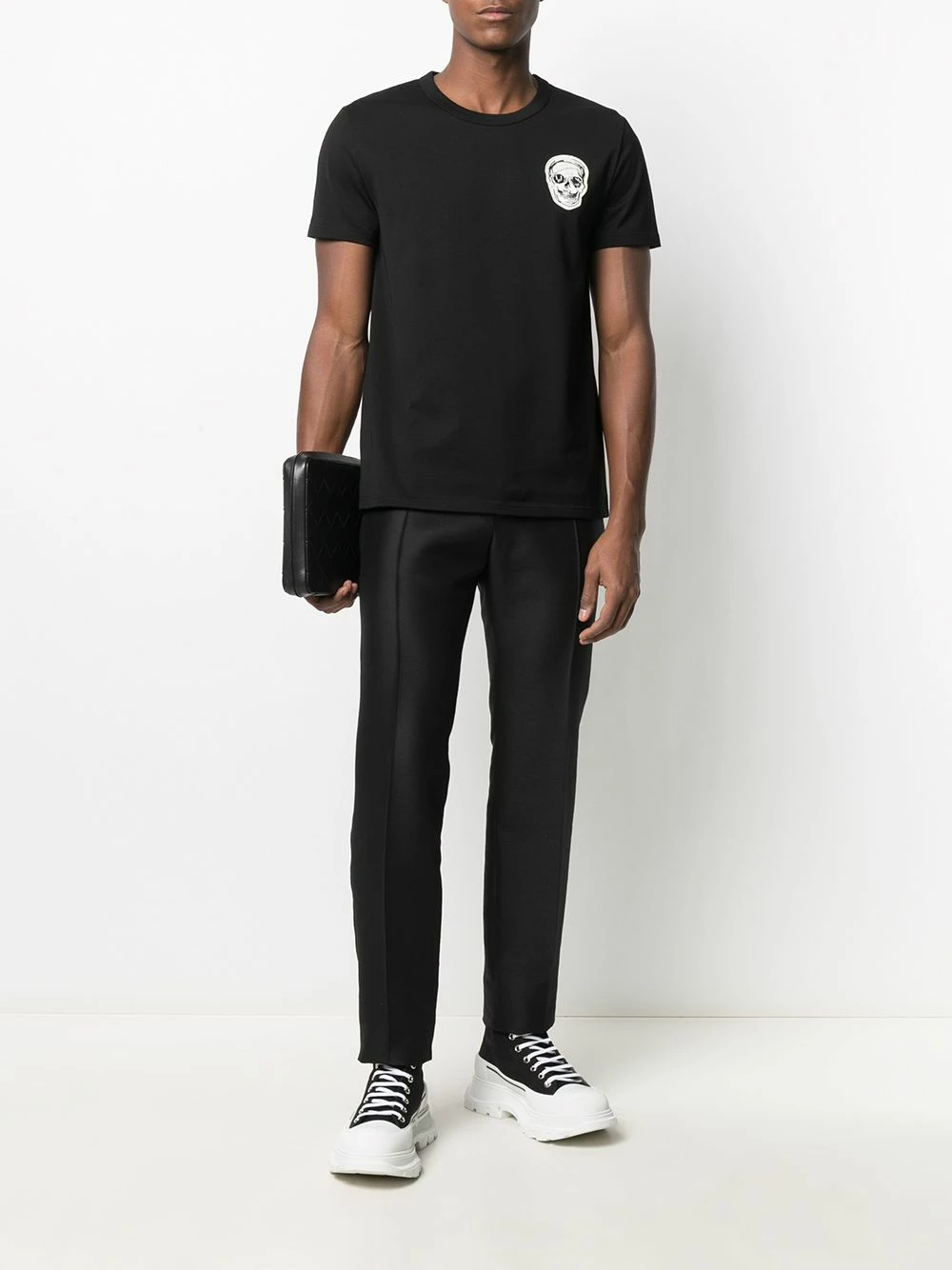 It’s not all doom and gloom. Yes, Alexander McQueen incorporated skull motifs and flirted with the afterlife in his designs since the ’90s, but your everyday wardrobe is about to get the upgrade it needs with this crew neck short-sleeved T-shirt. Glass half-full, right?