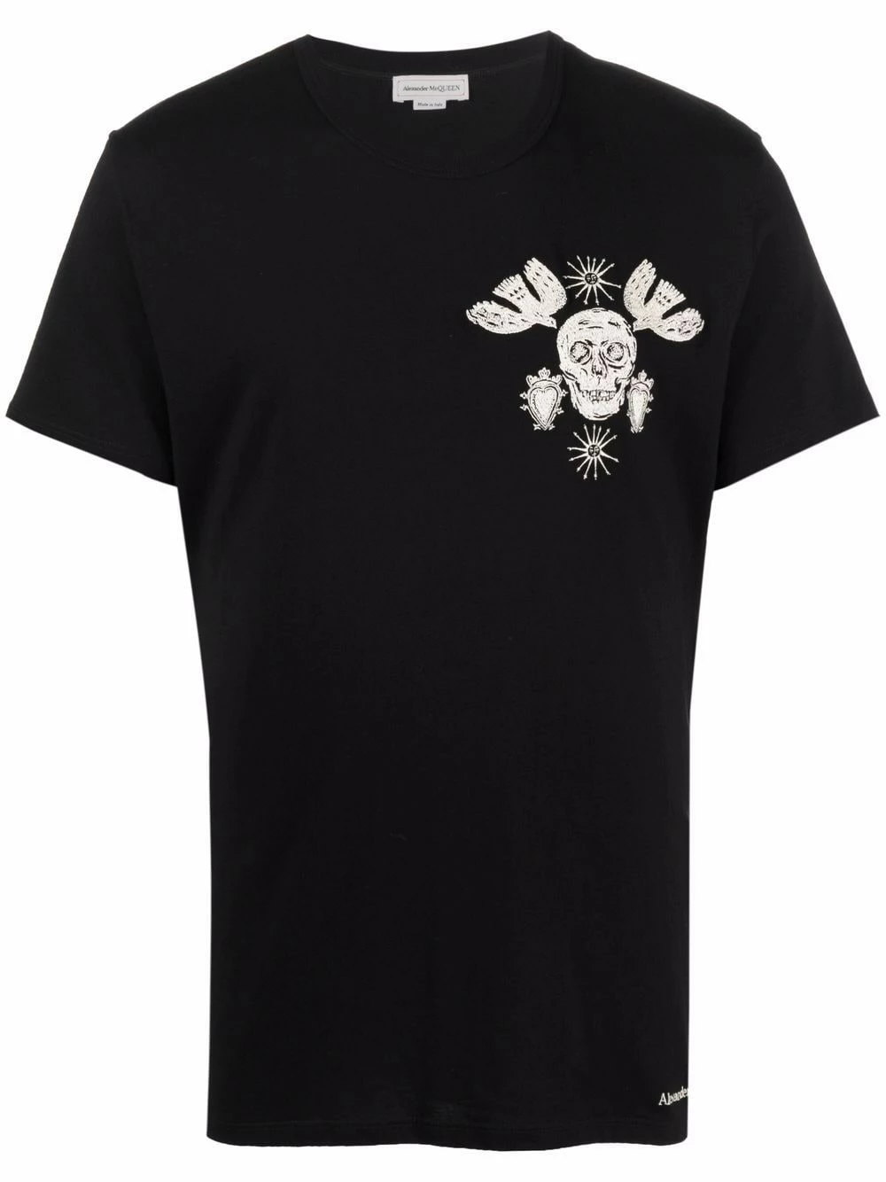 This AW21 under Sarah Burton’s creative direction, Alexander McQueen’s latest collection is decorated with hearts, doves and sun motifs. All three insignias can be found in a contrasting white print on this black T-shirt.