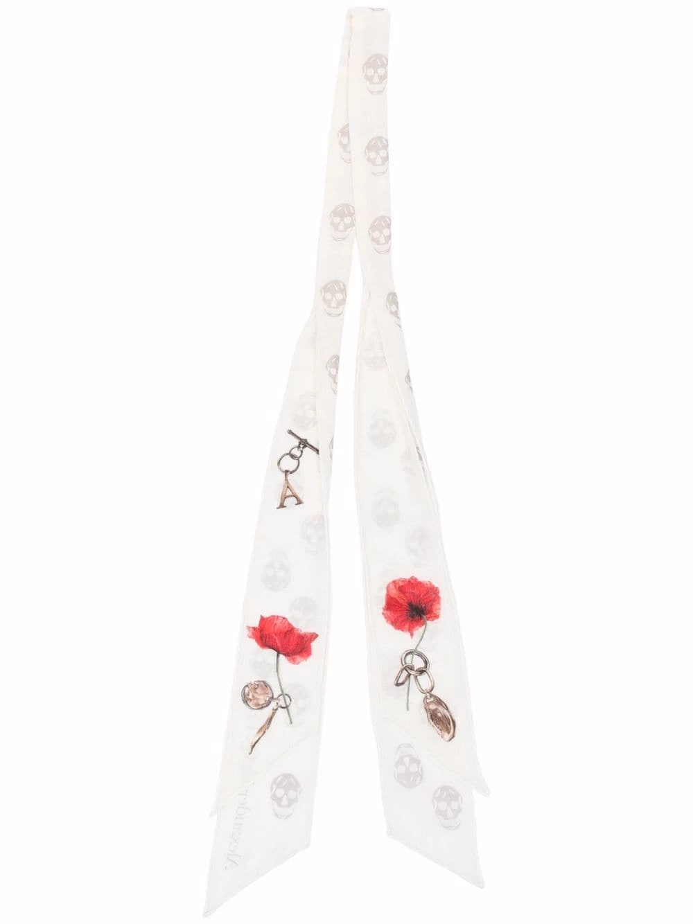 Alexander McQueen’s decadent spirit is portraited in this wool scarf. A white wool background is adorned with the brand’s iconic Skull motif and red roses for a touch of the house’s iconic dark romanticism.