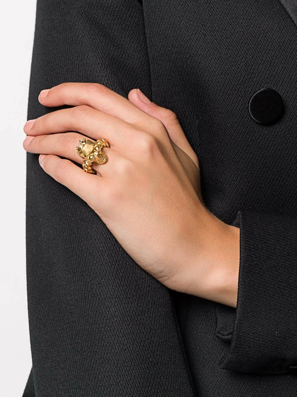Make a real statement with this skull ring from Alexander McQueen featuring Swarovski crystal embellishments and a gold-toned finish.
