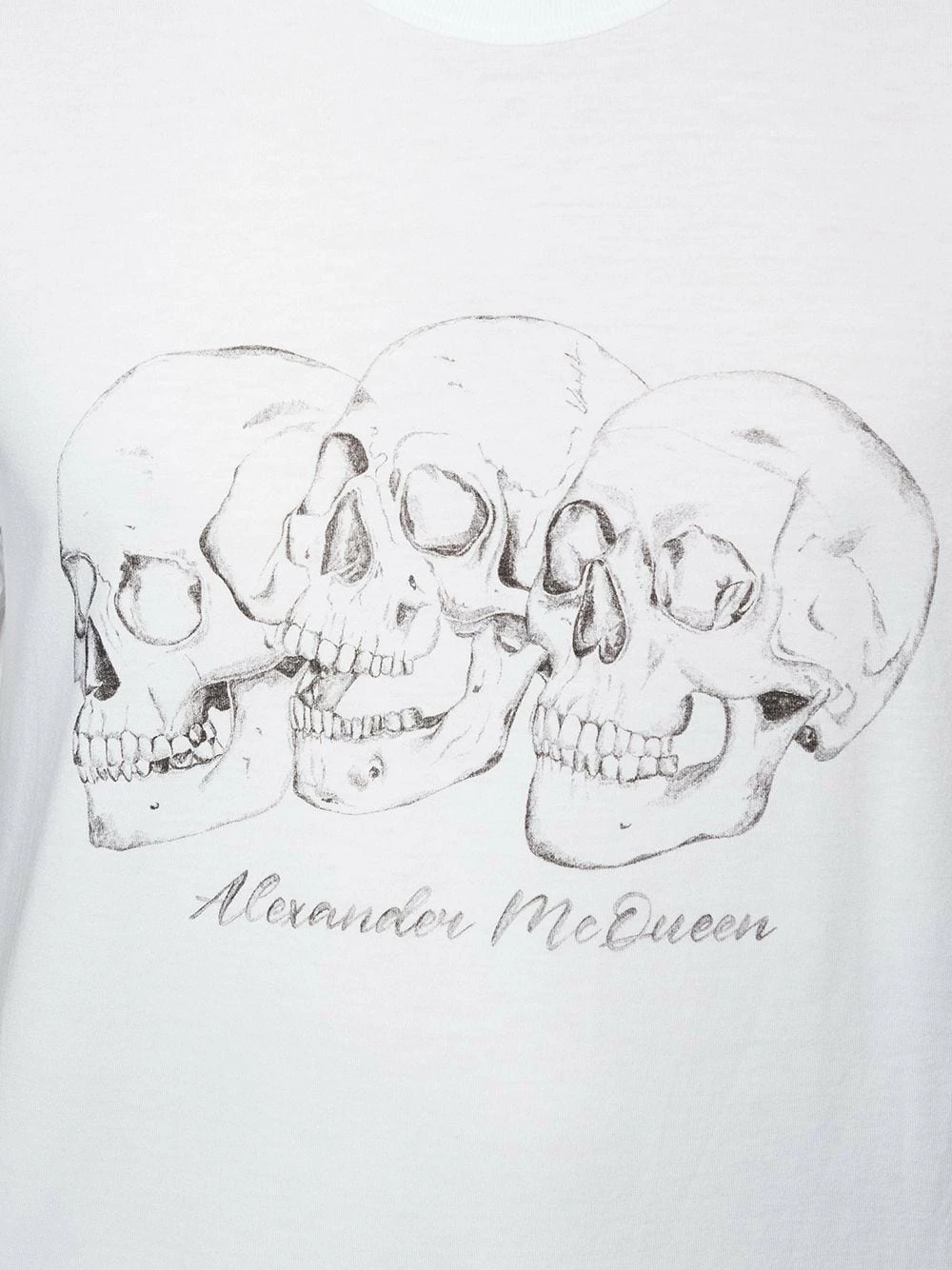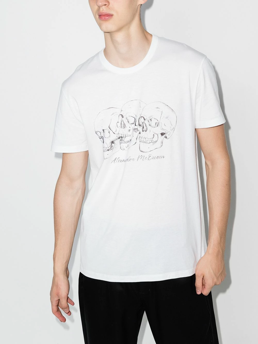 This white cotton T-shirt perfectly embodies the Alexander McQueen brand with a graphic print towards the chest depicting signature skulls.