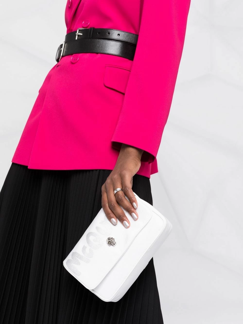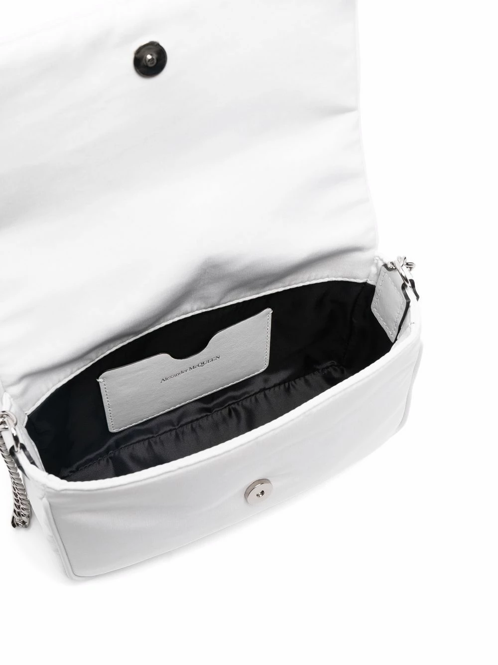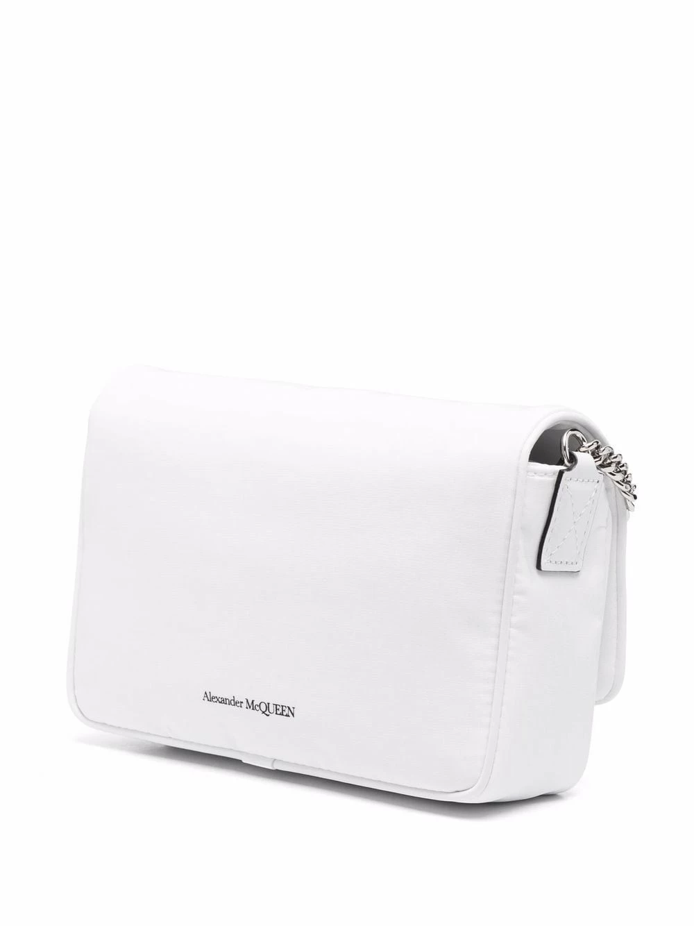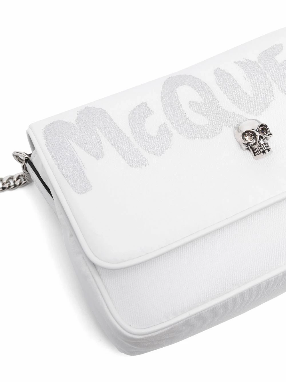 For AW21, Alexander McQueen offers a plethora of graffiti-emblazoned accessories including this crossbody bag. Designed from soft white fabric, this bag boasts logo lettering in a contrasting hue as well as a skull charm, a long-standing icon of the label.