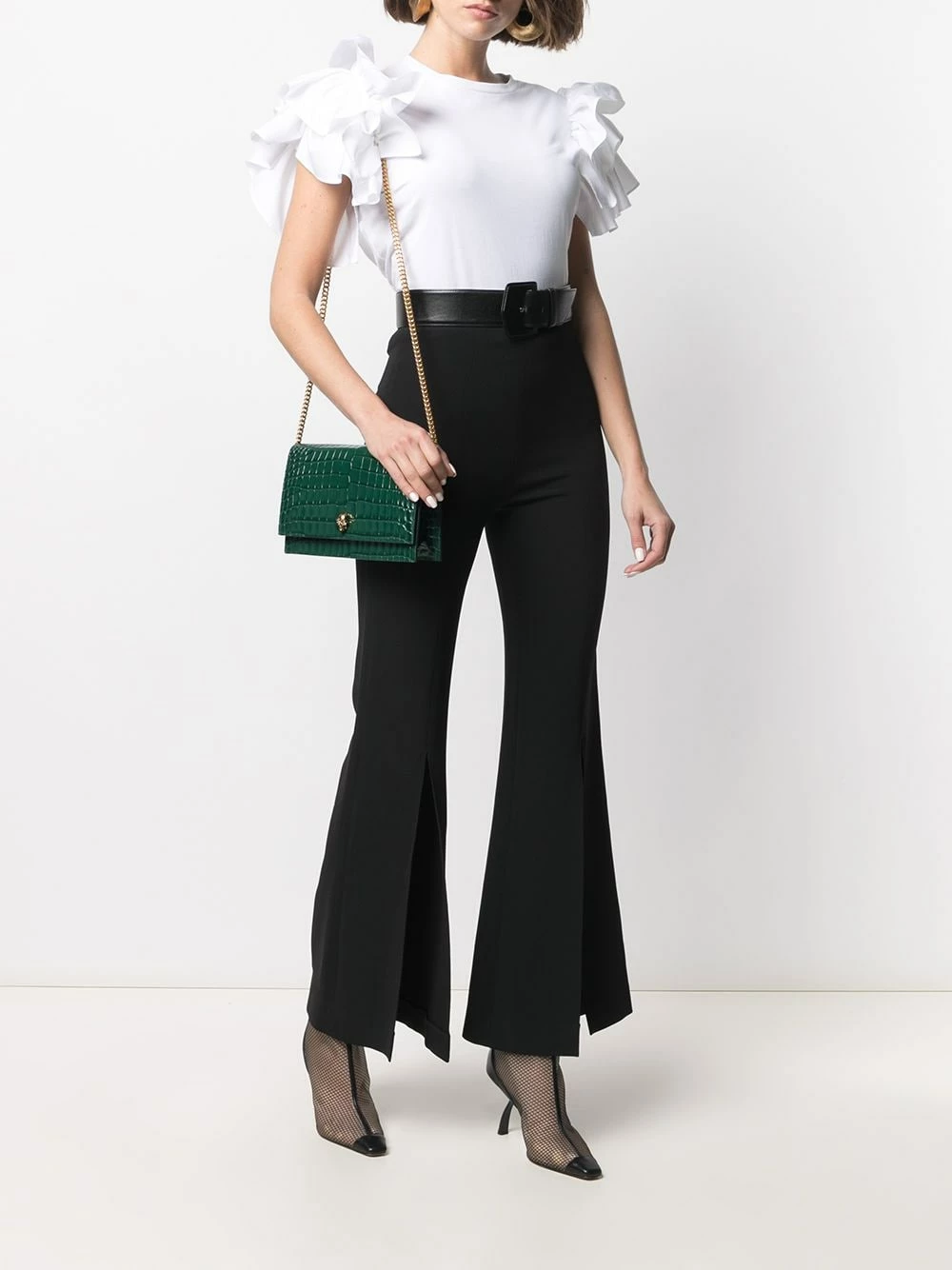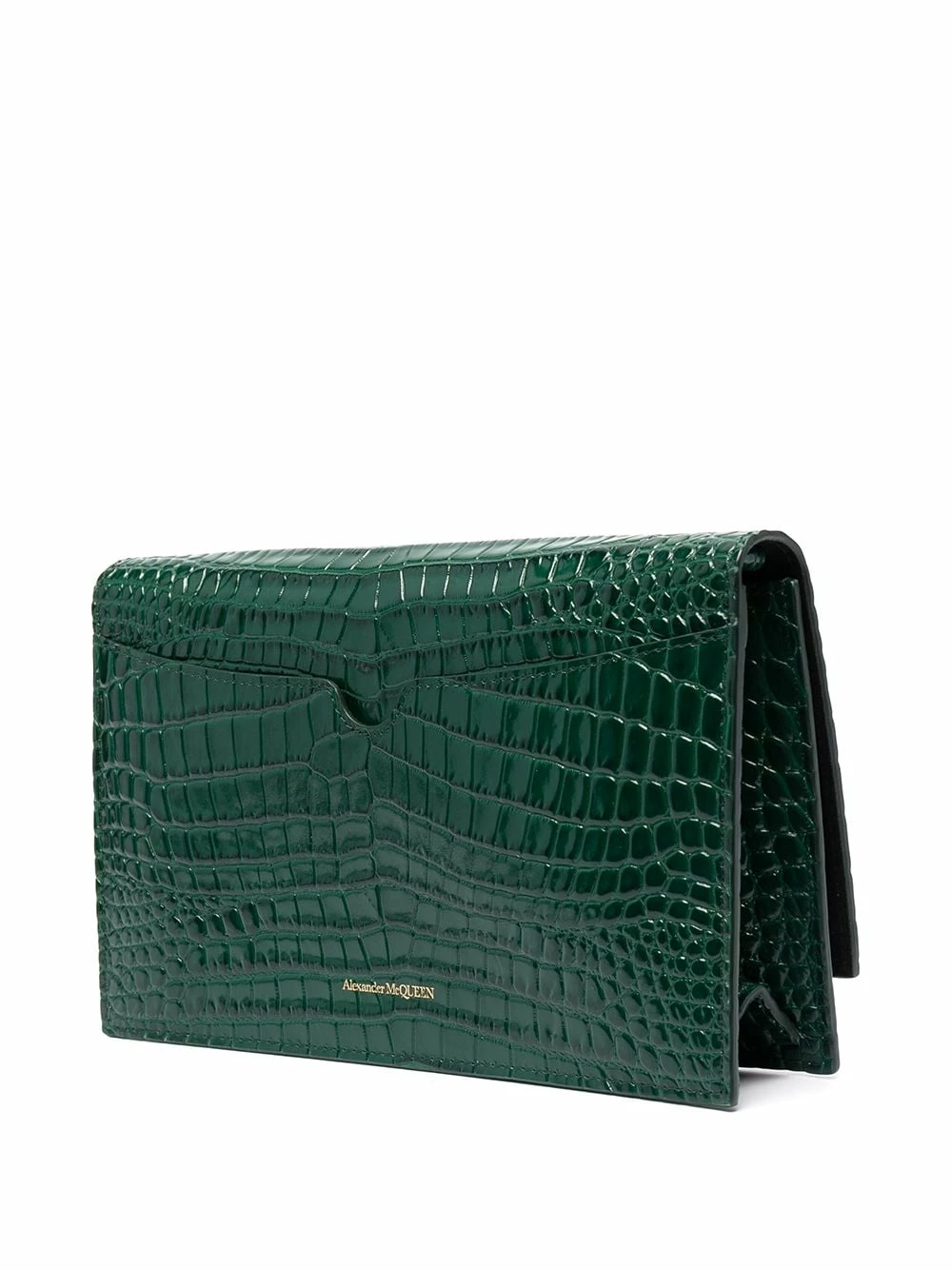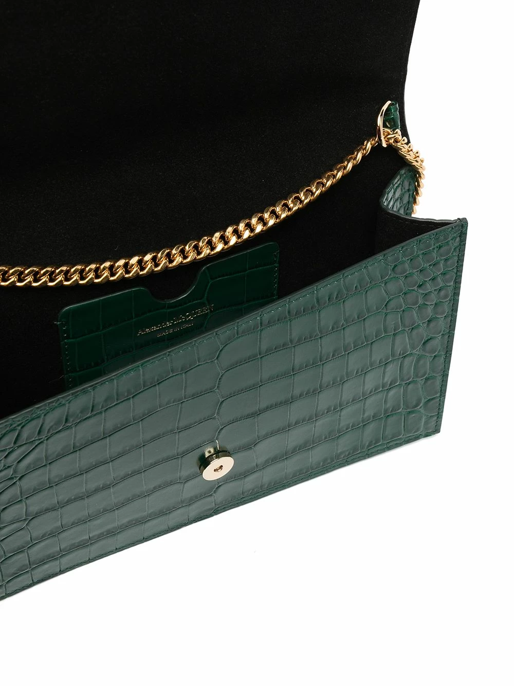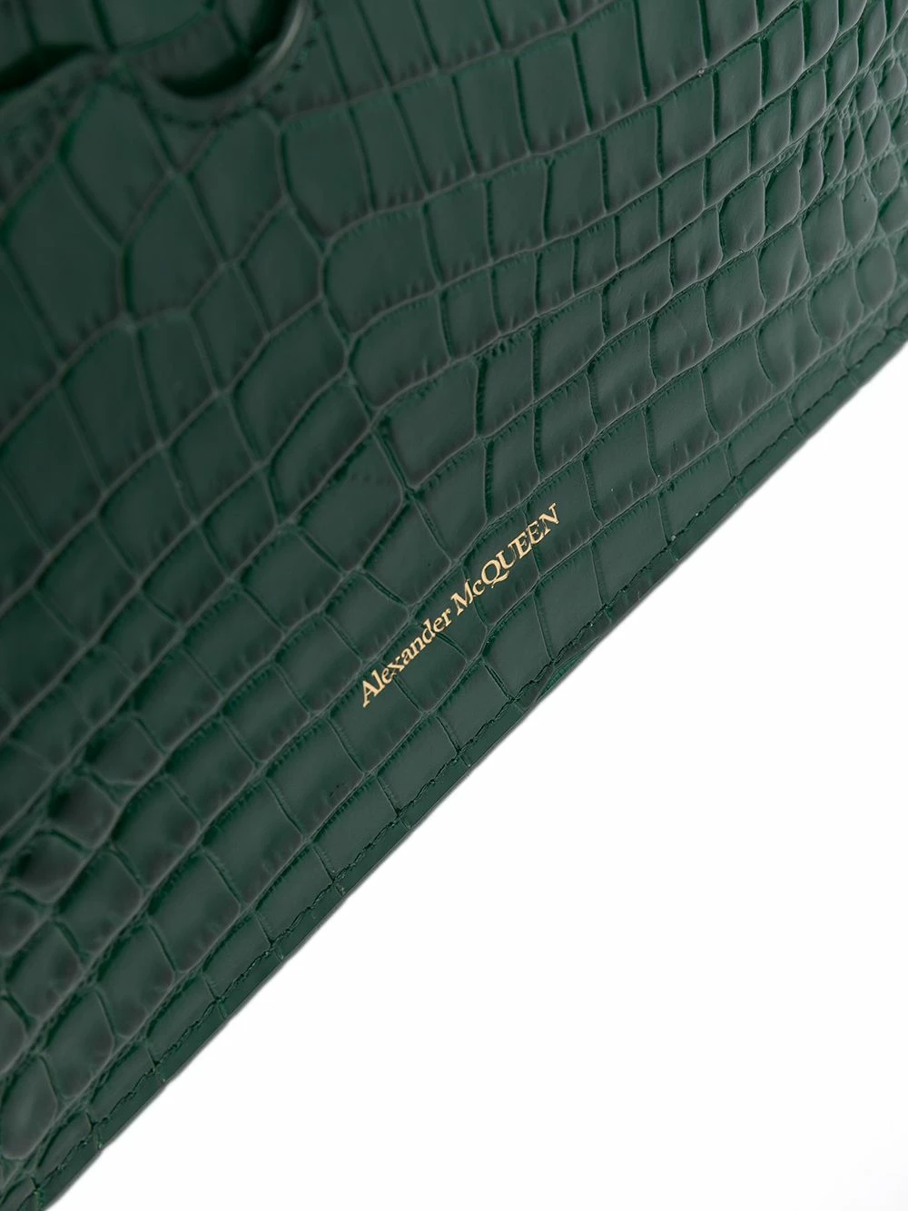 Gothic meets glamour. Known for taking spooky motifs and adopting them into typical stylish silhouettes, Alexander McQueen presents the Skull bag in emerald green leather for SS21. Hauntingly handsome.