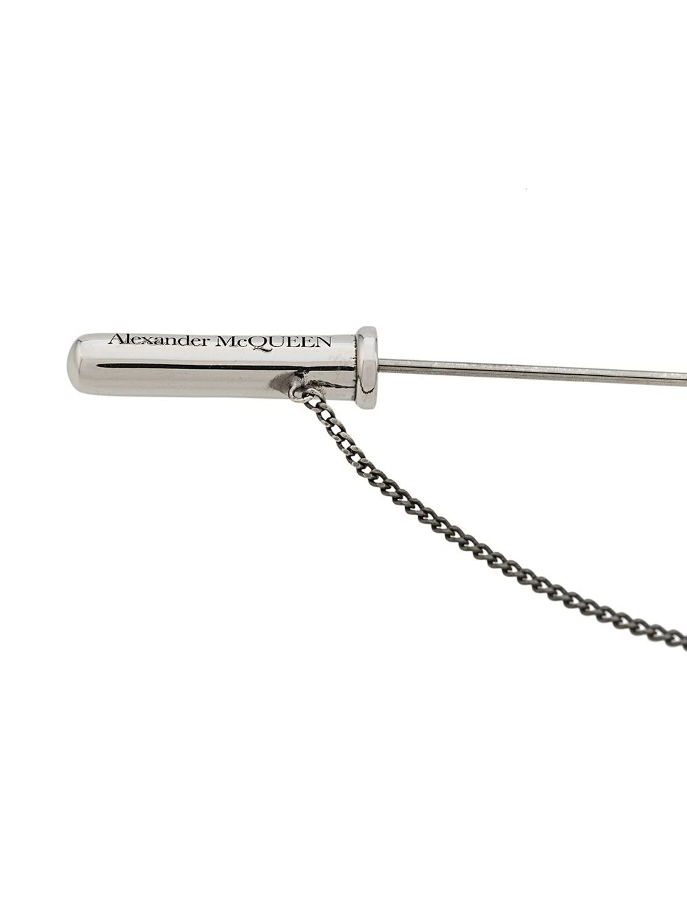 The theme of nature shines through Alexander McQueen’s latest collection, showcased through the brand’s intricate, ornate embellishing and insect prints, as seen in this silver-tone brass spider and skull brooch. Featuring silver-tone hardware, a pin fastening, an engraved logo, a black crystal embellishment, a signature spider and skull motif and a hanging delicate chain.