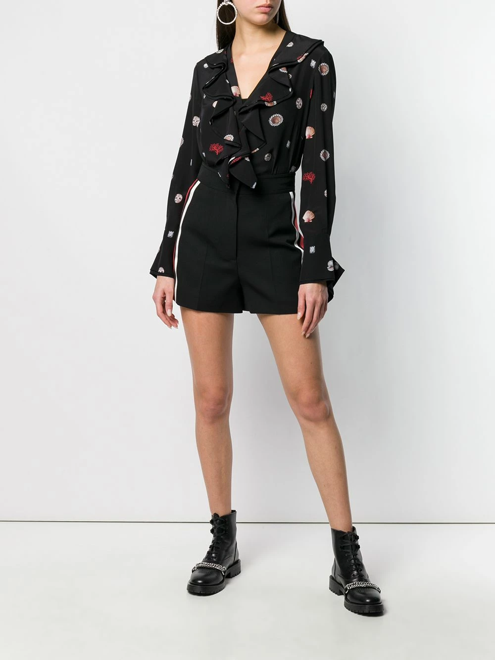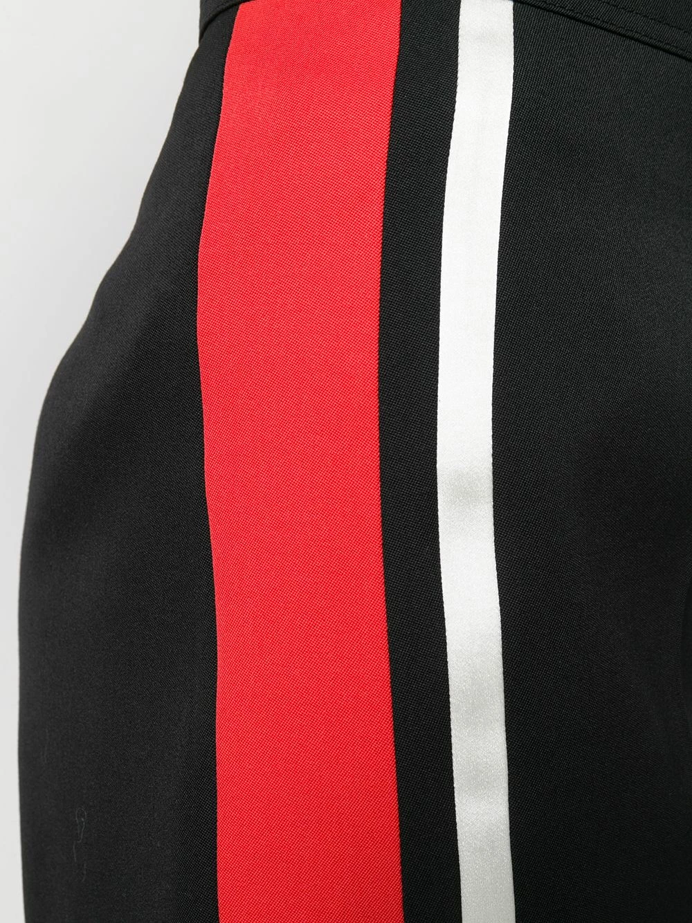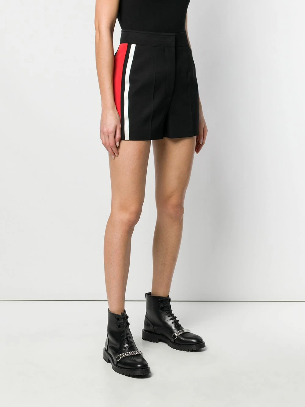Alexander McQueen is renowned for being the champion of eye-popping theatrics, toughening up everyday accessories with gothic romanticism. Fashioned in Italy from black, red and white virgin wool and silk blend, these stripe detail shorts from Alexander McQueen feature a high rise, a concealed front fastening and a bold red and white stripe to the sides.