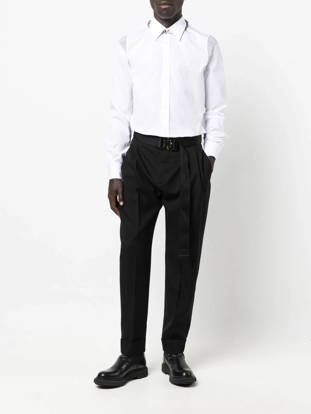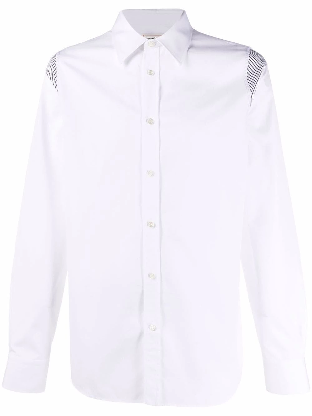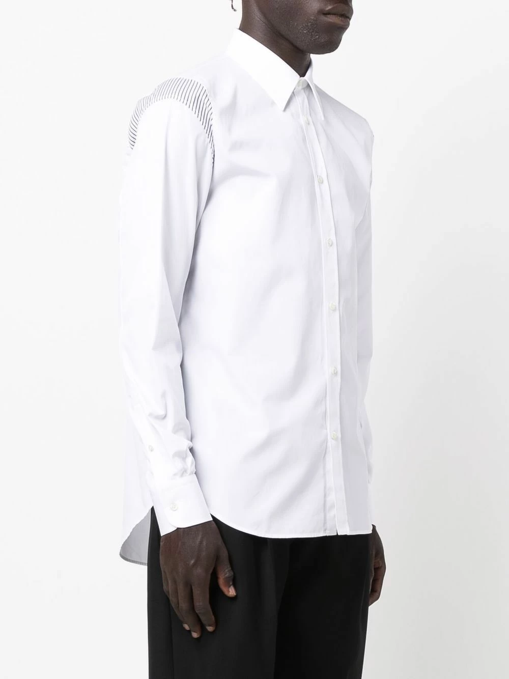 Alexander McQueen re-works the classic work shirt with striped insert panels at each shoulder. Crafted from crisp cotton, the long sleeve silhouette is finished with a pointed collar and curved hemline.
