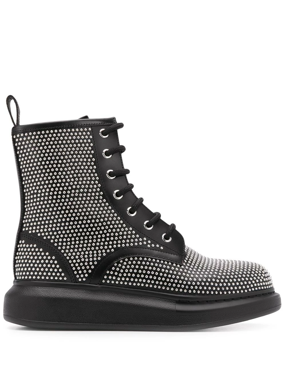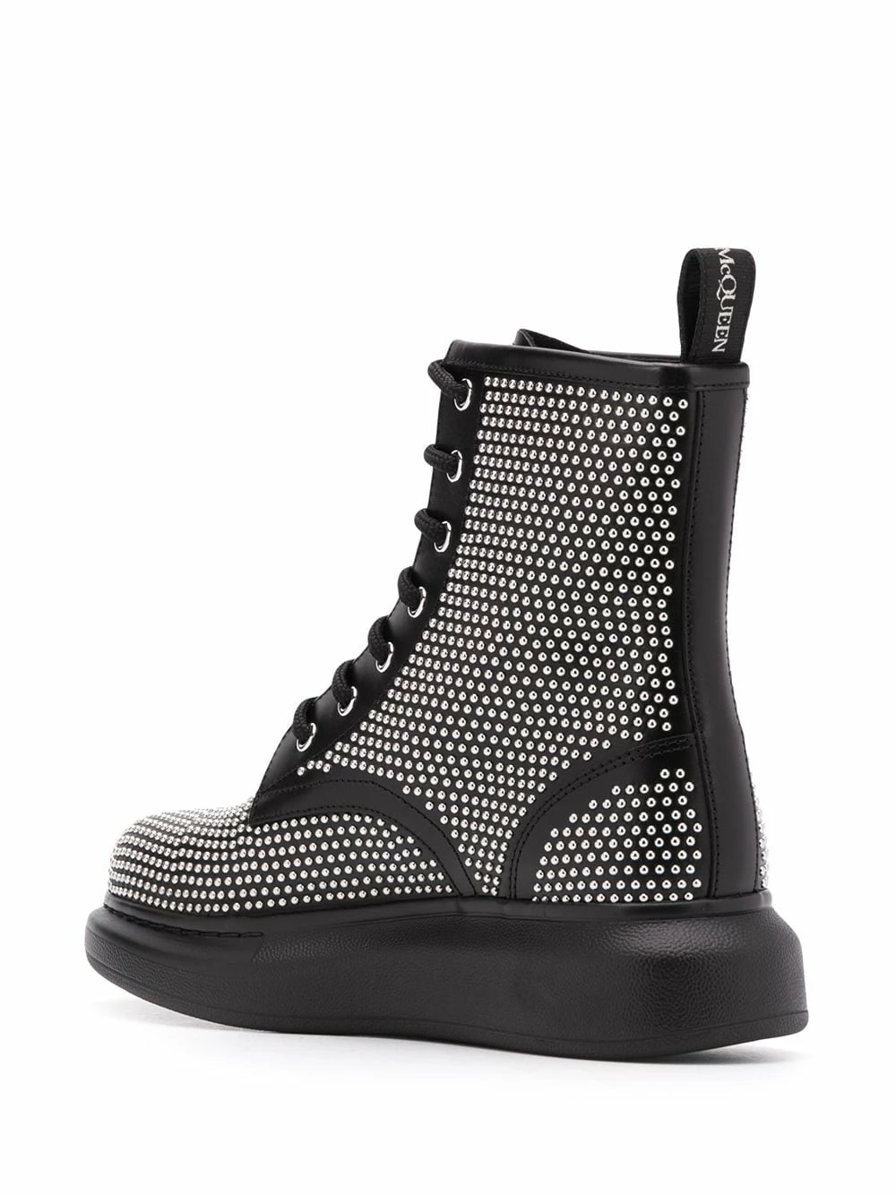 Nothing says “Get out of my way!” like this pair of studded lace-up ankle boots from Alexander McQueen. The all-over stud detail suggests that you are a force to be reckoned with. Add this to any outfit to instantly toughen it up. Featuring micro stud details, a platform sole, a round toe, an ankle length and a pull tab at the rear.