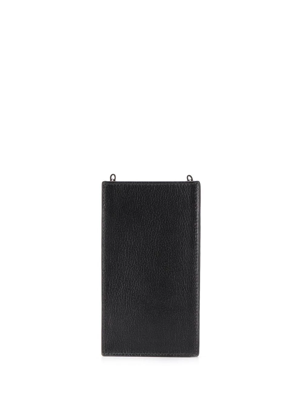 Skulls have become an iconic emblem within Alexander McQueen’s collections, injecting a morbid memento mori into decadently embellished pieces such as this black leather studded skull lanyard. Featuring spike stud accents, a rhinestone skull detail, a silver-tone chain shoulder strap and multiple card slots.