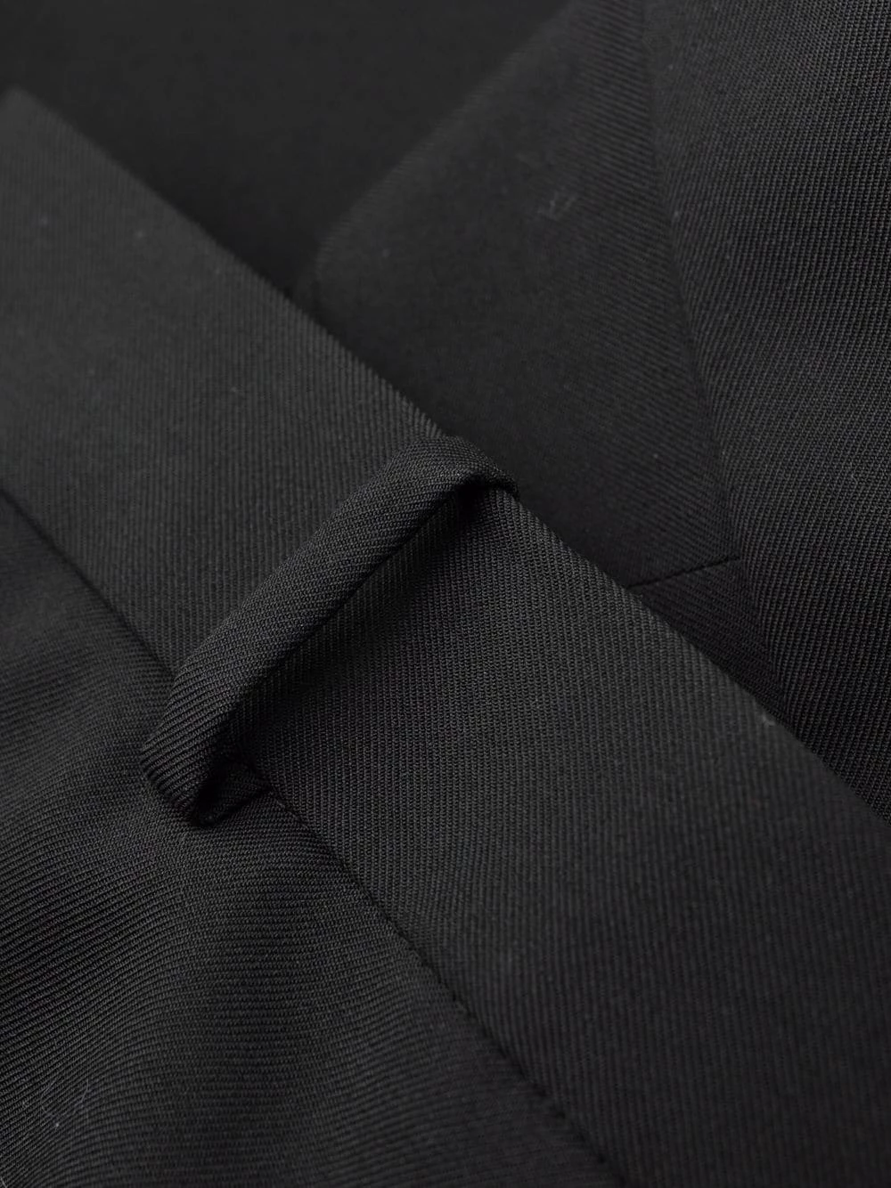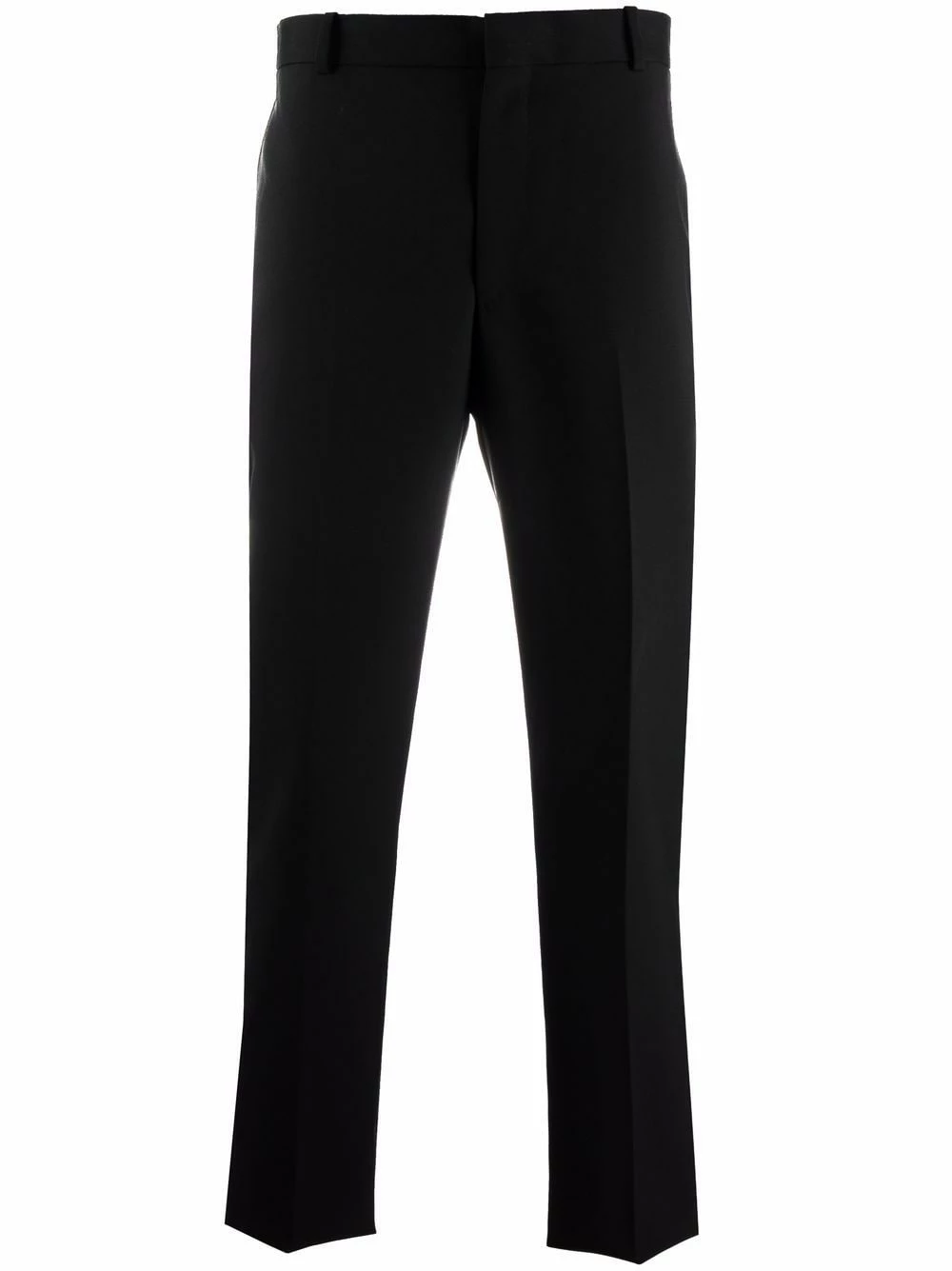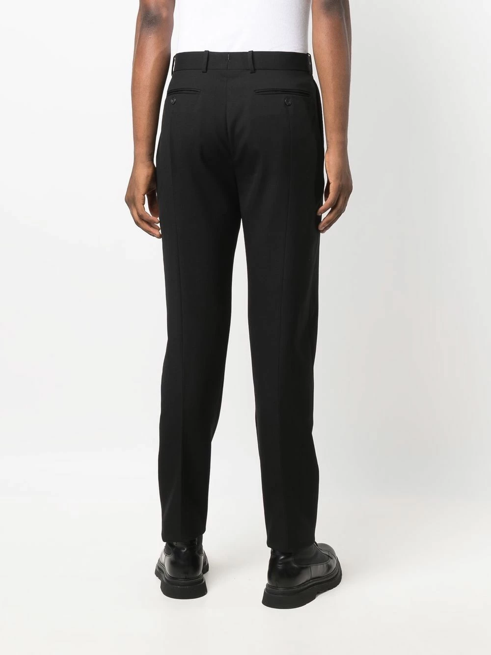 Black cotton/wool/cupro tailored-fit regular-length trousers from Alexander McQueen featuring mid-rise, belt loops, concealed front fastening, slip pockets to the sides, two rear button-fastening jetted pockets and pressed crease.