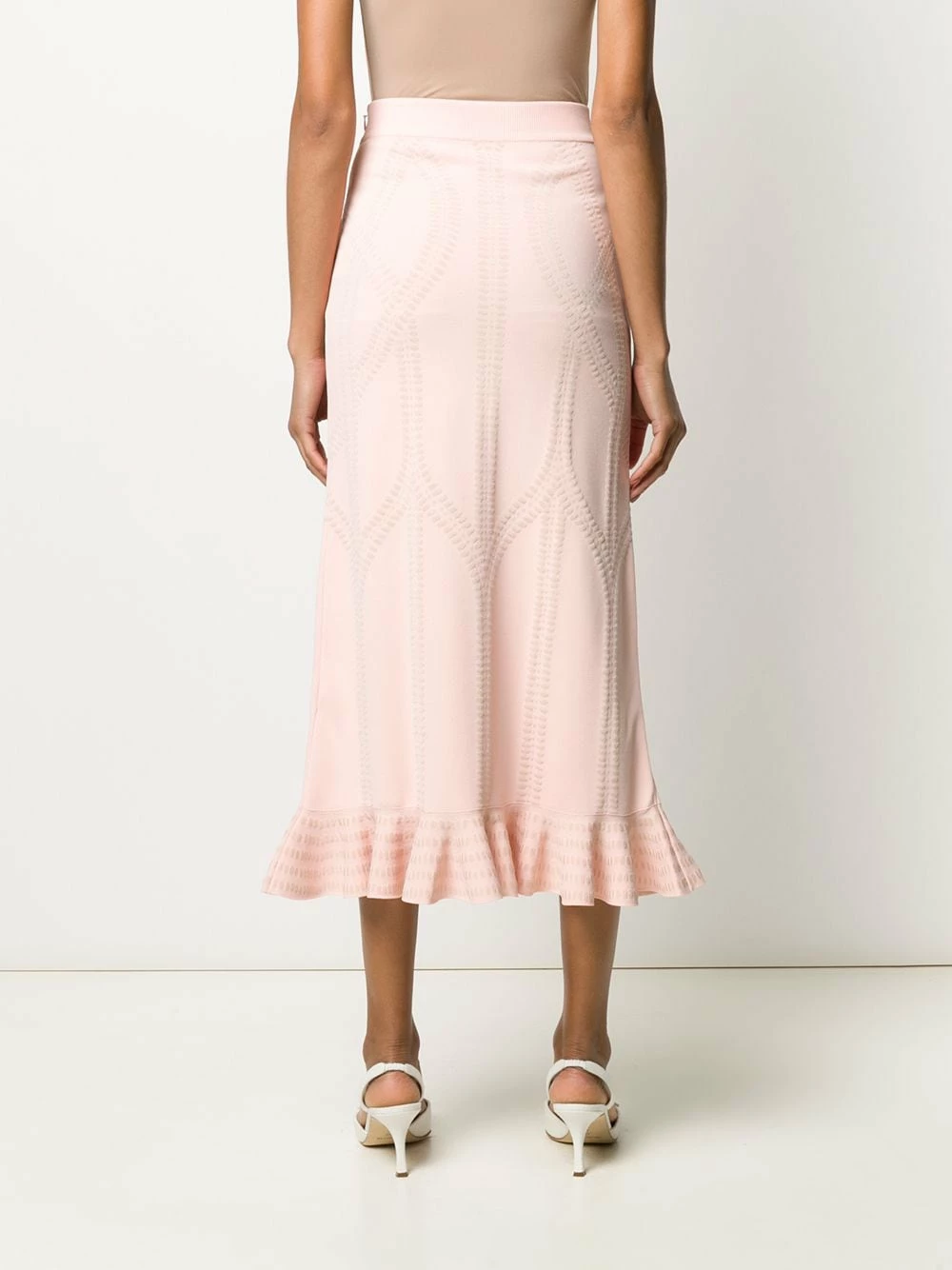 Why blend in when you can wear McQueen? This baby pink textured knitted frilled skirt from Alexander McQueen will make sure all eyes are on you, no matter the room you find yourself in. You’re a star – shine bright like one. Featuring a high waist, a knitted style, ribbed trimming, a textured style and layers of frills.