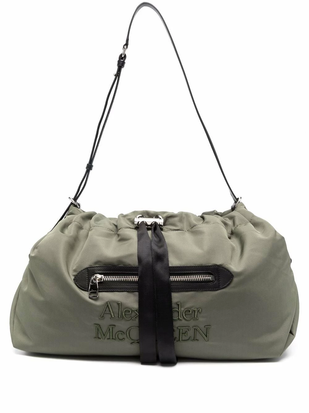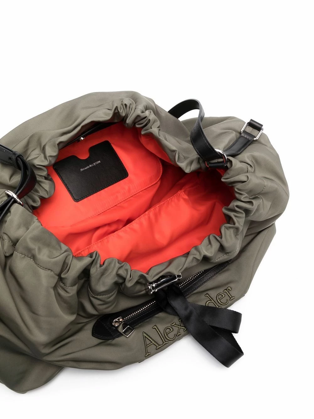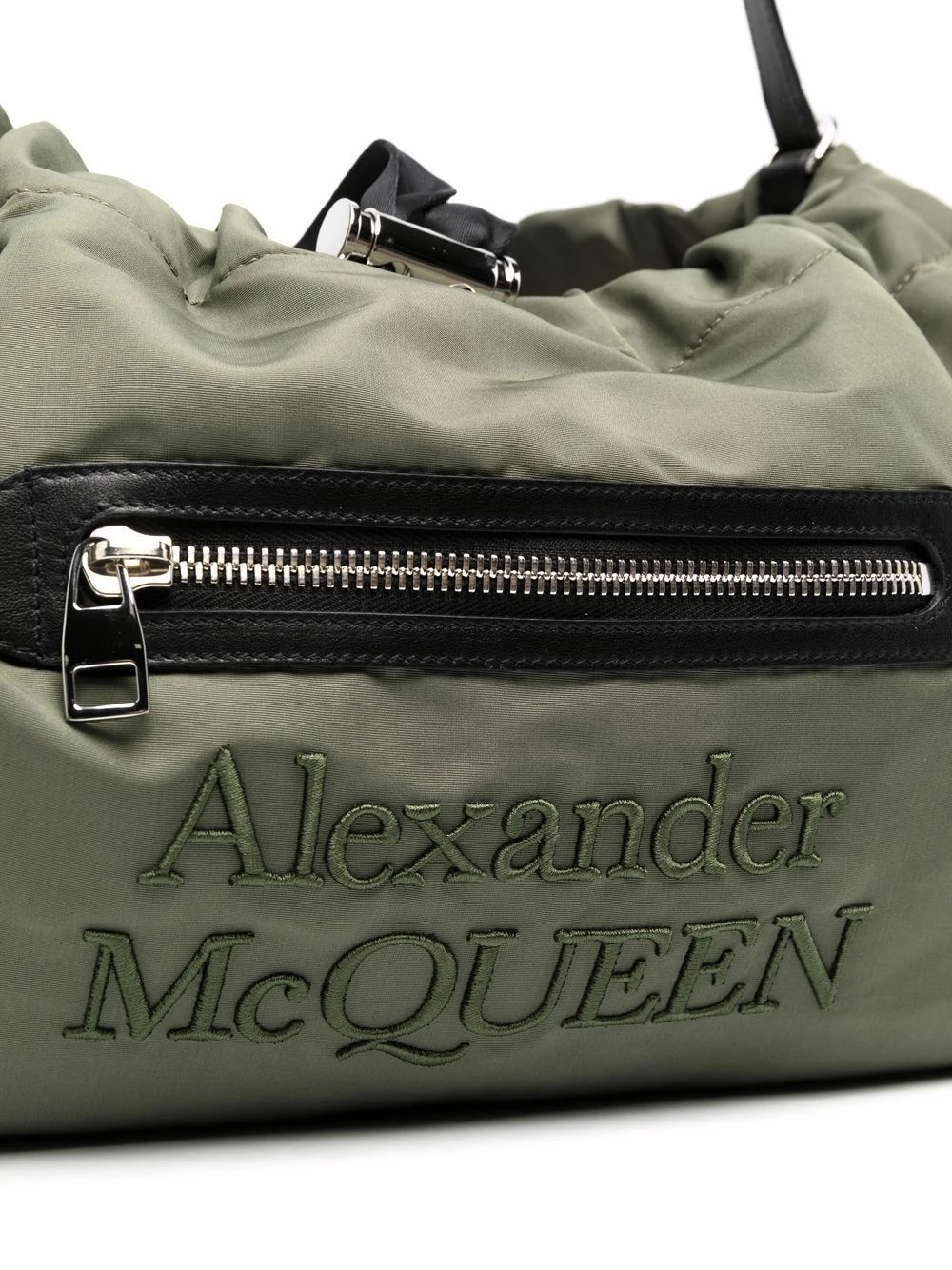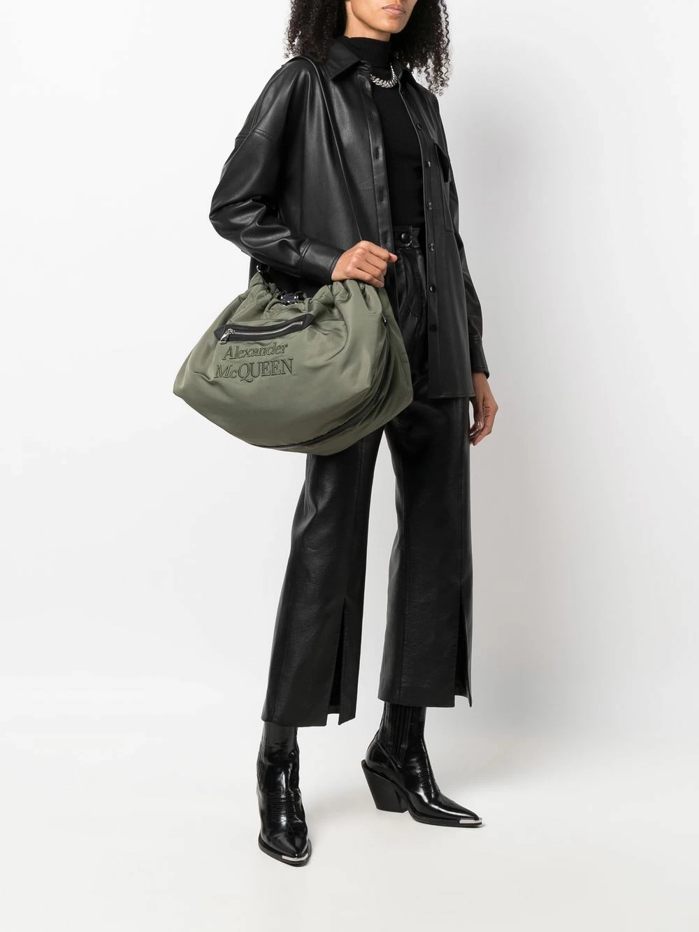 Distinguished by its slouchy design, The Bundle bag is updated for AW21. Presented in a khaki green hue, this accessory features a tonal embroidered Alexander McQueen signature and is finished with a drawstring closure.